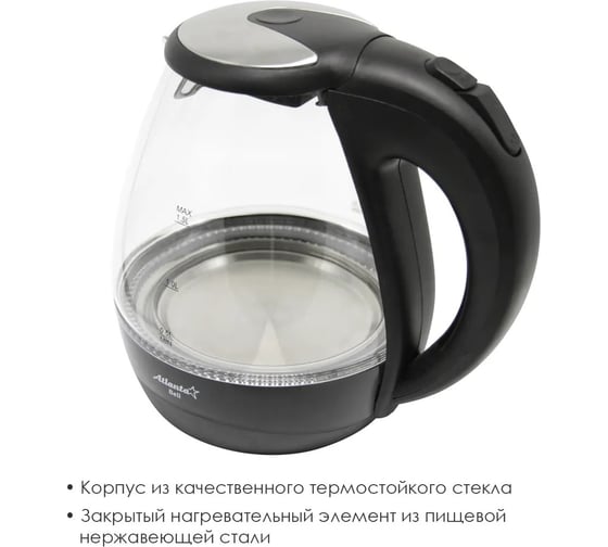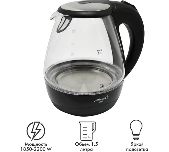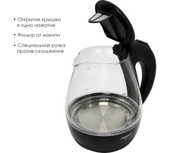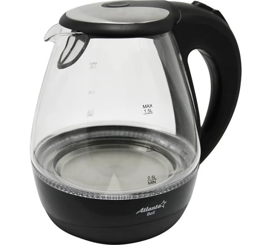 Стеклянный электрический чайник Atlanta ATH-2460 black предназначен для использования в офисе или дома.