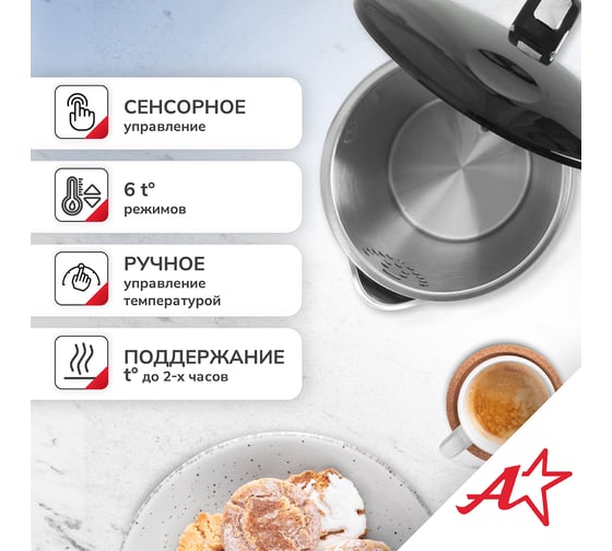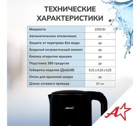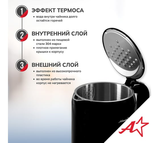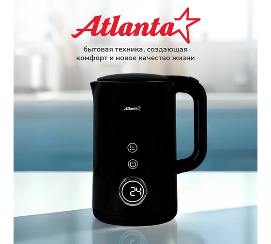 Электрический чайник Atlanta — это стильный и функциональный прибор, который станет незаменимым помощником на вашей кухне. Двойные стенки чайника обеспечивают эффективное сохранение тепла, а вращение на подставке на 360° гарантирует удобство использования. Вы можете выбрать одну из четырех температурных настроек, чтобы приготовить идеальный напиток для любого случая. Корпус из нержавеющей стали и пластика придает чайнику прочность и элегантный внешний вид. Удобное управление делает процесс использования простым и интуитивно понятным.