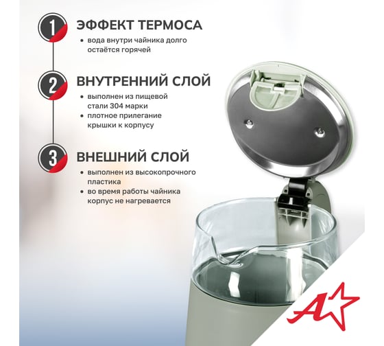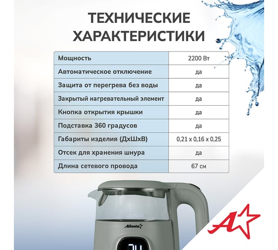 Электрический чайник Atlanta — это стильный и функциональный прибор, который станет незаменимым помощником на вашей кухне. Двойные стенки чайника обеспечивают эффективное сохранение тепла, а вращение на подставке на 360° гарантирует удобство использования. Вы можете выбрать одну из четырех температурных настроек, чтобы приготовить идеальный напиток для любого случая. Корпус из нержавеющей стали и пластика придает чайнику прочность и элегантный внешний вид. Удобное управление делает процесс использования простым и интуитивно понятным.