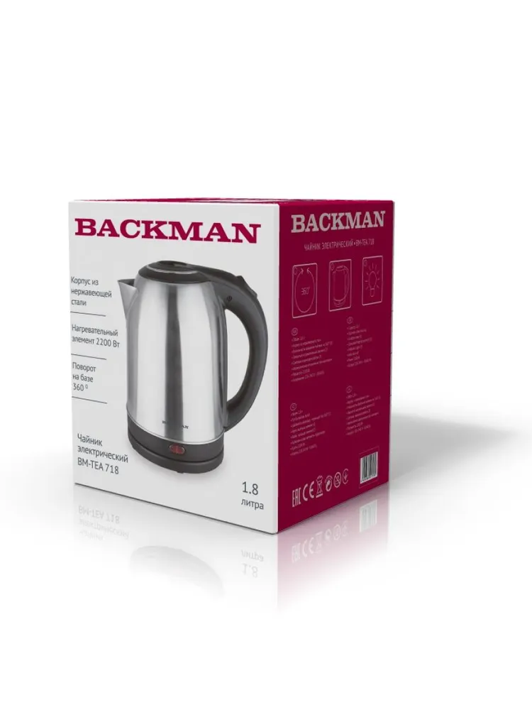Электрочайник BACKMAN BM-TEA 718 1,8 л, корпус из высококачественного термостойкого стекла и пластика, закрытый нагревательный элемент, вращение подставки на 360°, световой индикатор работы, шкала уровня воды, автоматическое отключение при закипании, автоматическое отключение без воды.