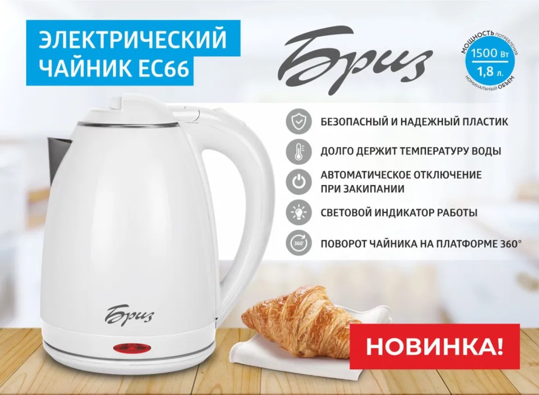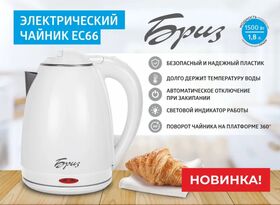 Электрический чайник ЕС66 "Бриз" с механическим типом управления удобен в обращении и способен за один раз нагреть до 1,8 л воды. Стильный современный дизайн позволяют чайнику гармонично смотреться в любом помещении, будь то кухня или офис. Благодаря вращающейся подставке прибор может поворачиваться на 360 градусов. Световая индикация сообщит, о готовности к работе. После закипания устройство автоматически отключится.