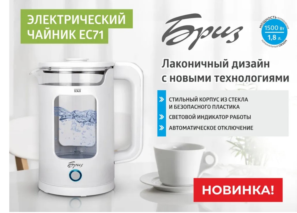 Объем чайника 1,8 л. функционирует от сети напряжением 220 В, а максимальная мощность составляет 1800 Вт. Корпус чайника изготовлен из стекла и высококачественного пластика, такая модель отличаются привлекательным внешним видом, высоким уровнем экологичности и позволяют визуально наблюдать за объемом воды.