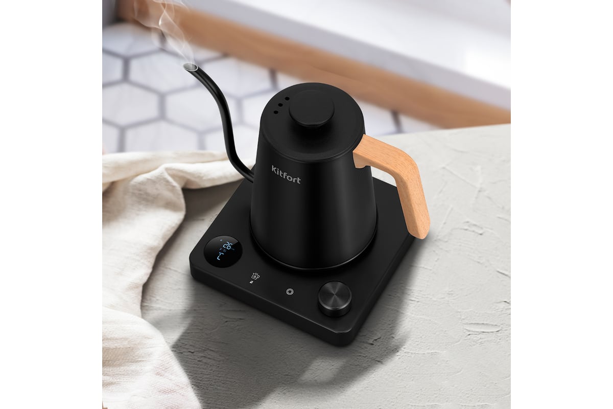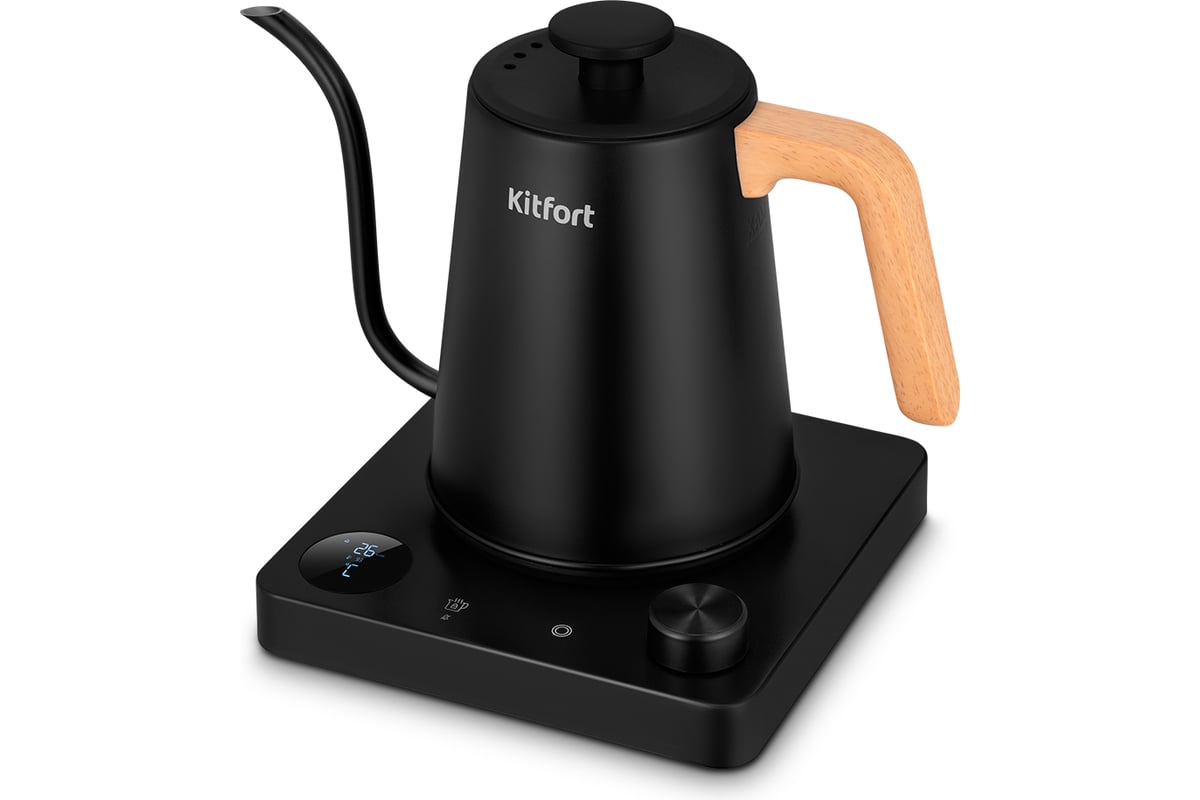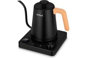 Электрический чайник для варки кофе Kitfort КТ-6726 предназначен для кипячения и нагрева воды, а также приготовления кофе способами кемекс или пуровер. Чайник может нагреть воду до температур от 40 до 100 °С, что очень удобно при приготовлении детского питания и заваривании кофе и различных сортов чая.