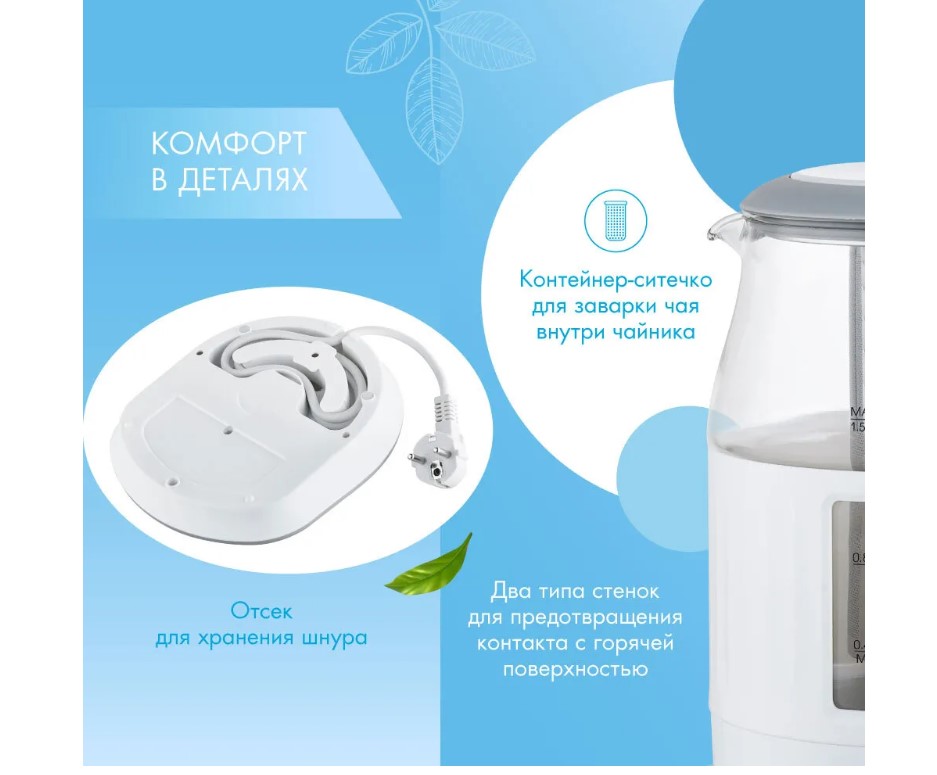 Красивый дизайн и приятный яркий внешний вид электрического чайника Skyline KR-364G позволит ему занять достойное место на любой кухне и идеально вписаться даже в самый изысканный интерьер. Высокая мощность устройства дает возможность быстро и качественно вскипятить большой объем воды, рассчитанный на 1,5 литра, благодаря чему даже большая и многочисленная семья может собраться вместе за одним столом на чаепитие. Ведь он просто идеально подходит для чаепитий, так как оснащен специальной сетчатой корзиной для заваривания чаев и травяных настоев.