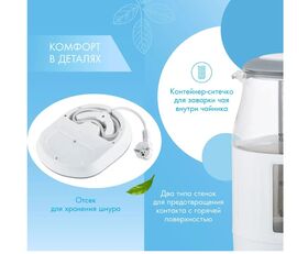 Дополнительными функциональными особенностями модели являются также двухсторонняя индикация уровня воды со шкалой, скрытый и безопасный нагревательный элемент, съемный фильтр-сетка, не пропускающий частицы накипи, и световой индикатор включения. Все это дополнено функцией поддержания температуры воды и 4-мя температурными режимами для подогрева воды.