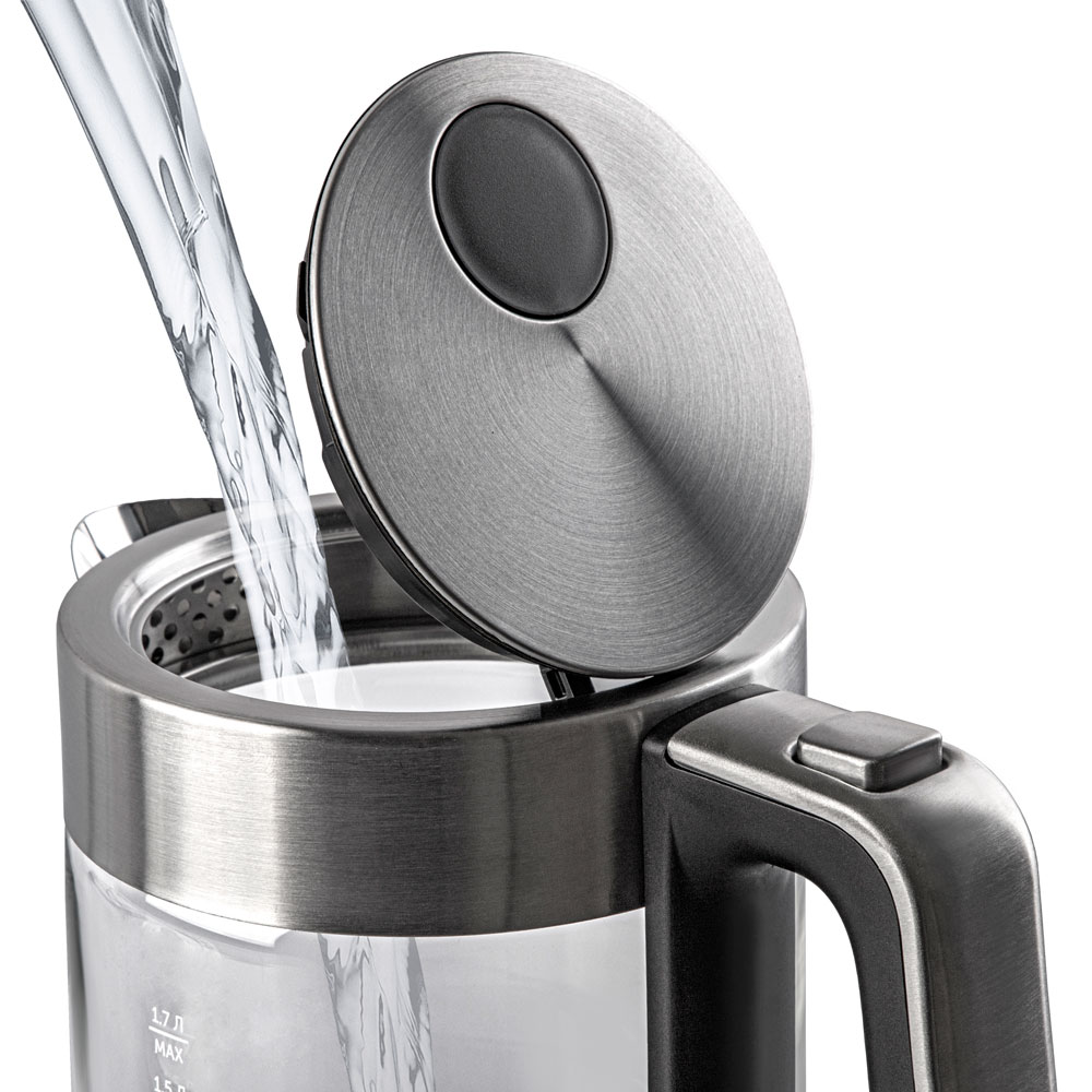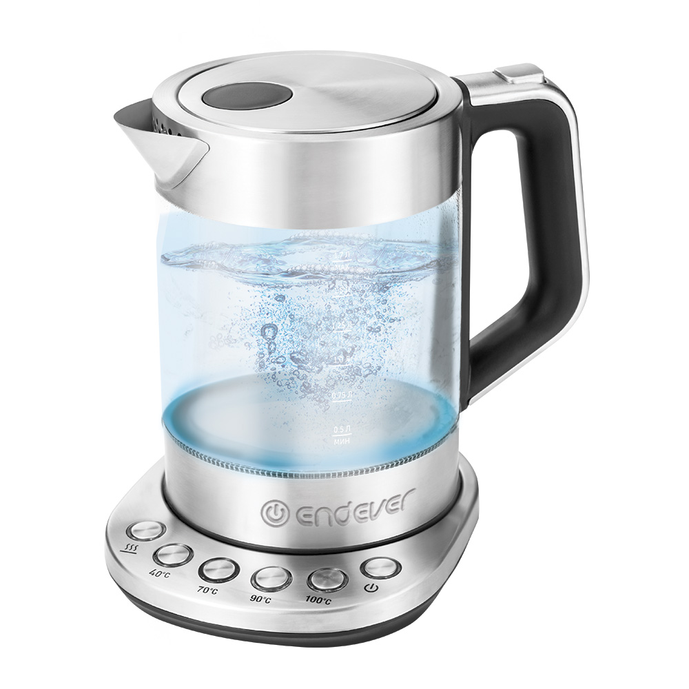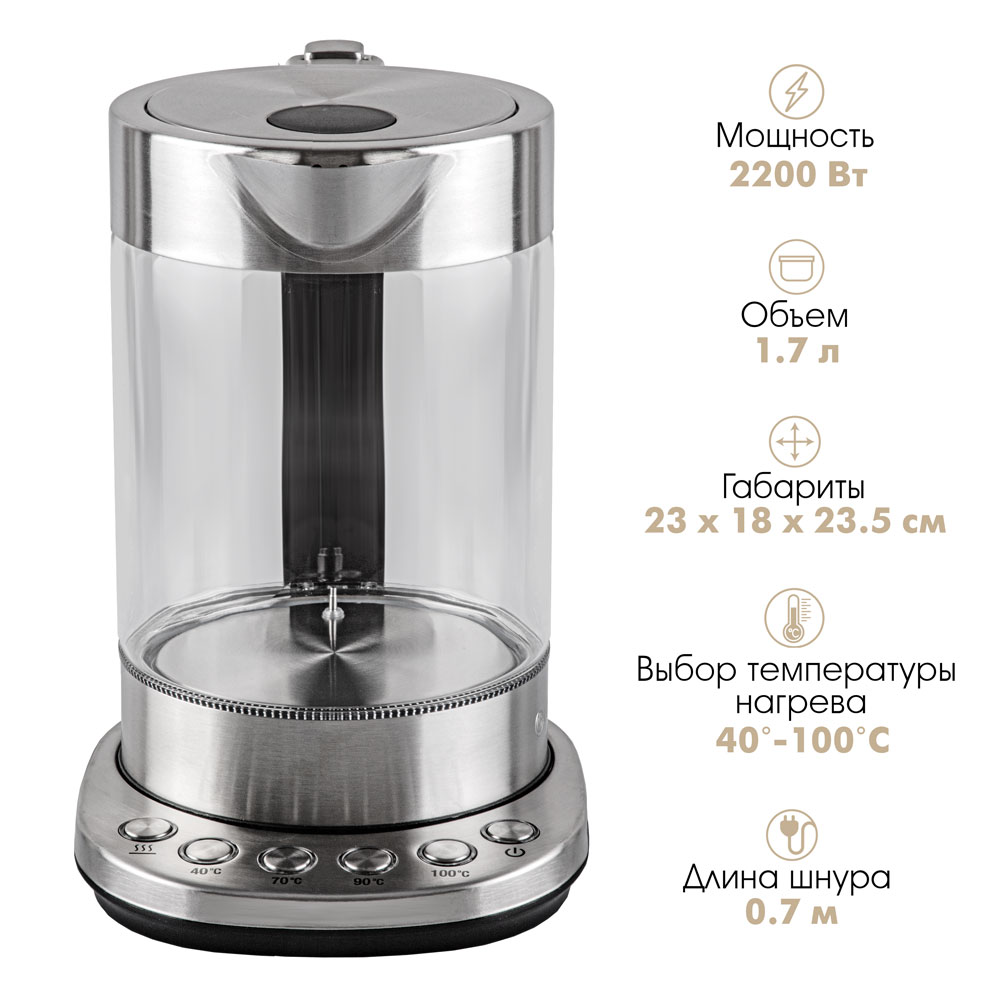 Особенности и дополнительные функции Кнопочная панель управления с светодиодной подсветкой, Отсек для хранения шнура, Эргономичная ненагревающаяся ручка, Беспроводное соединение позволяет вращать чайник на подставке на 360°, Скрытый нагревательный элемент, Световой индикатор включения, Функция поддержания температуры, Автоотключение при закипании, Автоотключение при отсутствии воды
