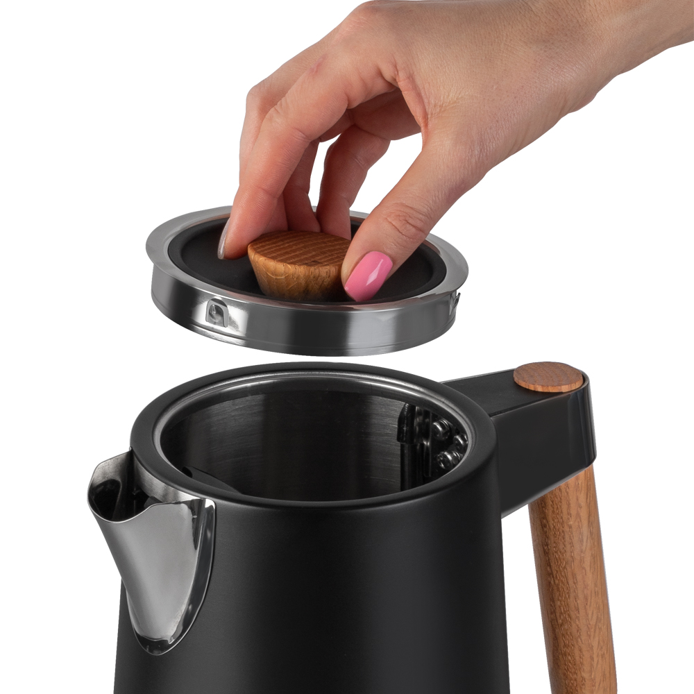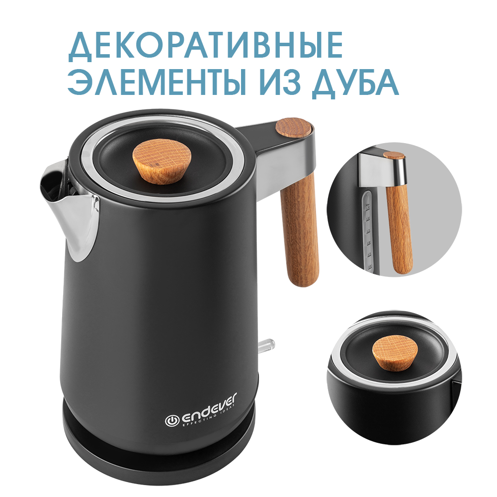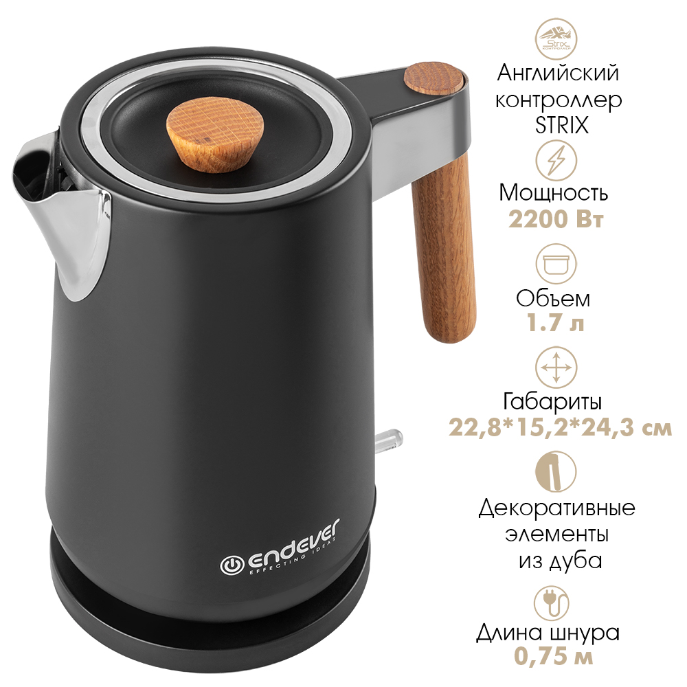Беспроводное соединение позволяет вращать чайник на подставке на 360 градусов, Корпус из нержавеющей стали, Ручка из натурального дуба, Английский контроллер STRIX, Автоотключение при закипании воды, Шкала уровня воды, Защита от перегрева, Скрытый нагревательный элемент, Съемный фильтр-сетка для защиты от накипи, Отсек для хранения шнура