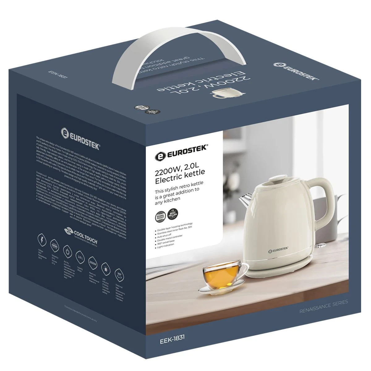 Технология двухслойного корпуса COOL TOUCH, дисковый нагревательный элемент, световая индикация работы, вращения чайника на подставке на 360, автоматическое отключение при закипании и при недостаточном количестве воды.