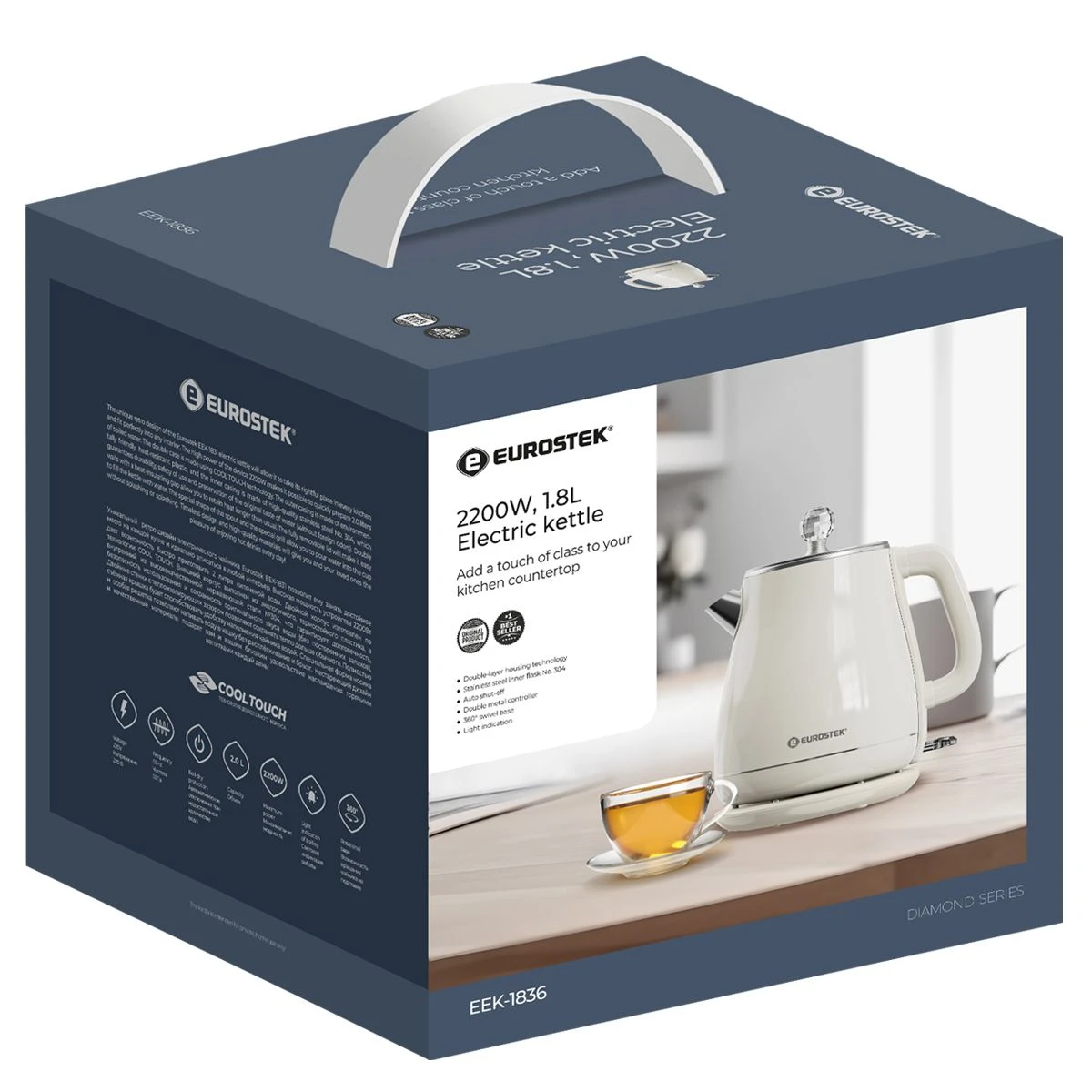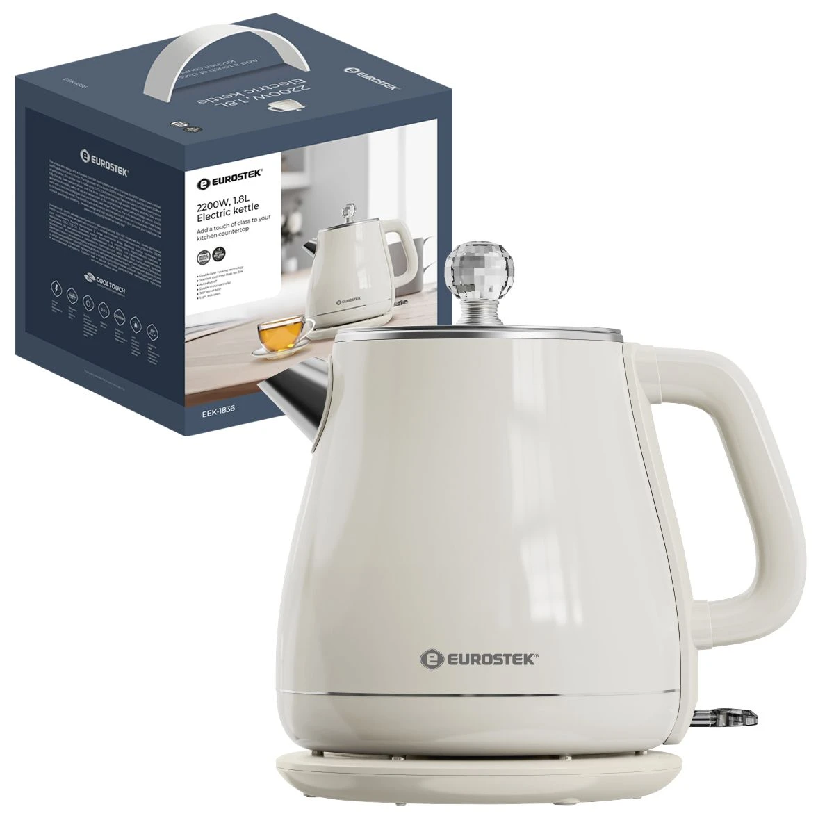 Технология двухслойного корпуса COOL TOUCH, дисковый нагревательный элемент, световая индикация работы, вращения чайника на подставке на 360, автоматическое отключение при закипании и при недостаточном количестве воды.