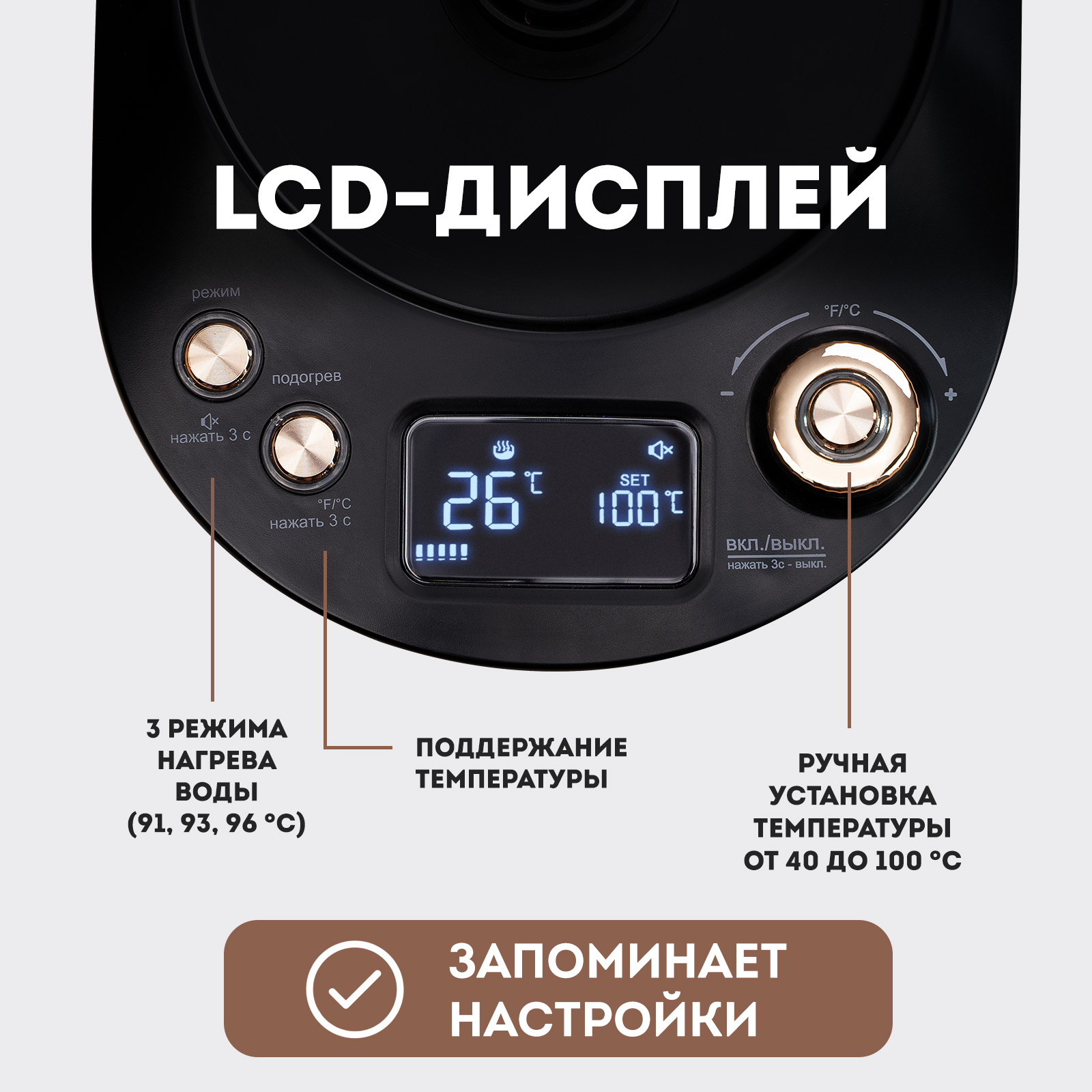 Мощность 1100 Вт и объем 1 литр обеспечивают быстрое и удобное приготовление. Три режима нагрева и ручная установка температуры от 40 до 100 °C позволяют нагревать воду до нужной температуры для разных сортов чая. Функции подогрева и поддержания температуры делают эксплуатацию чайника еще удобнее.