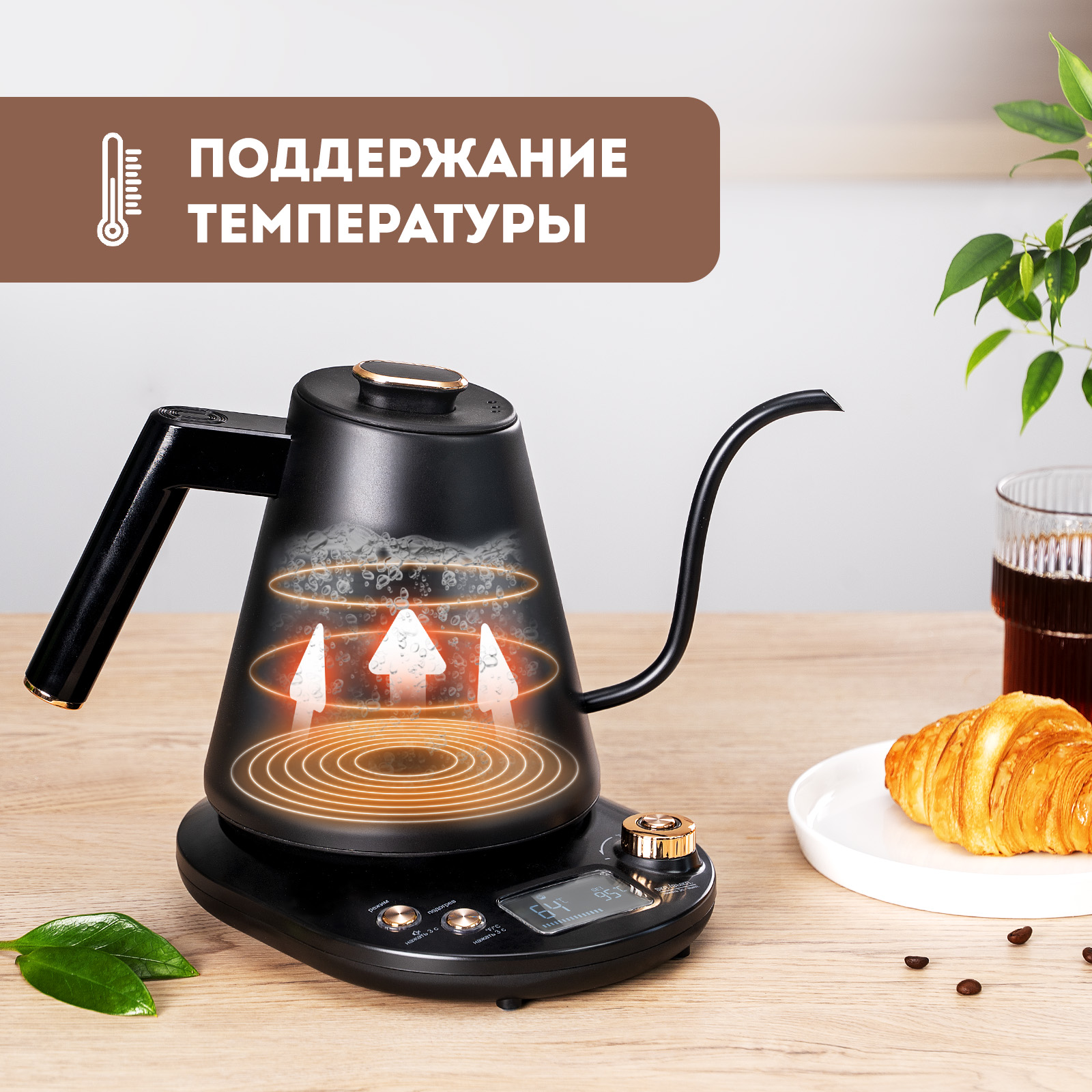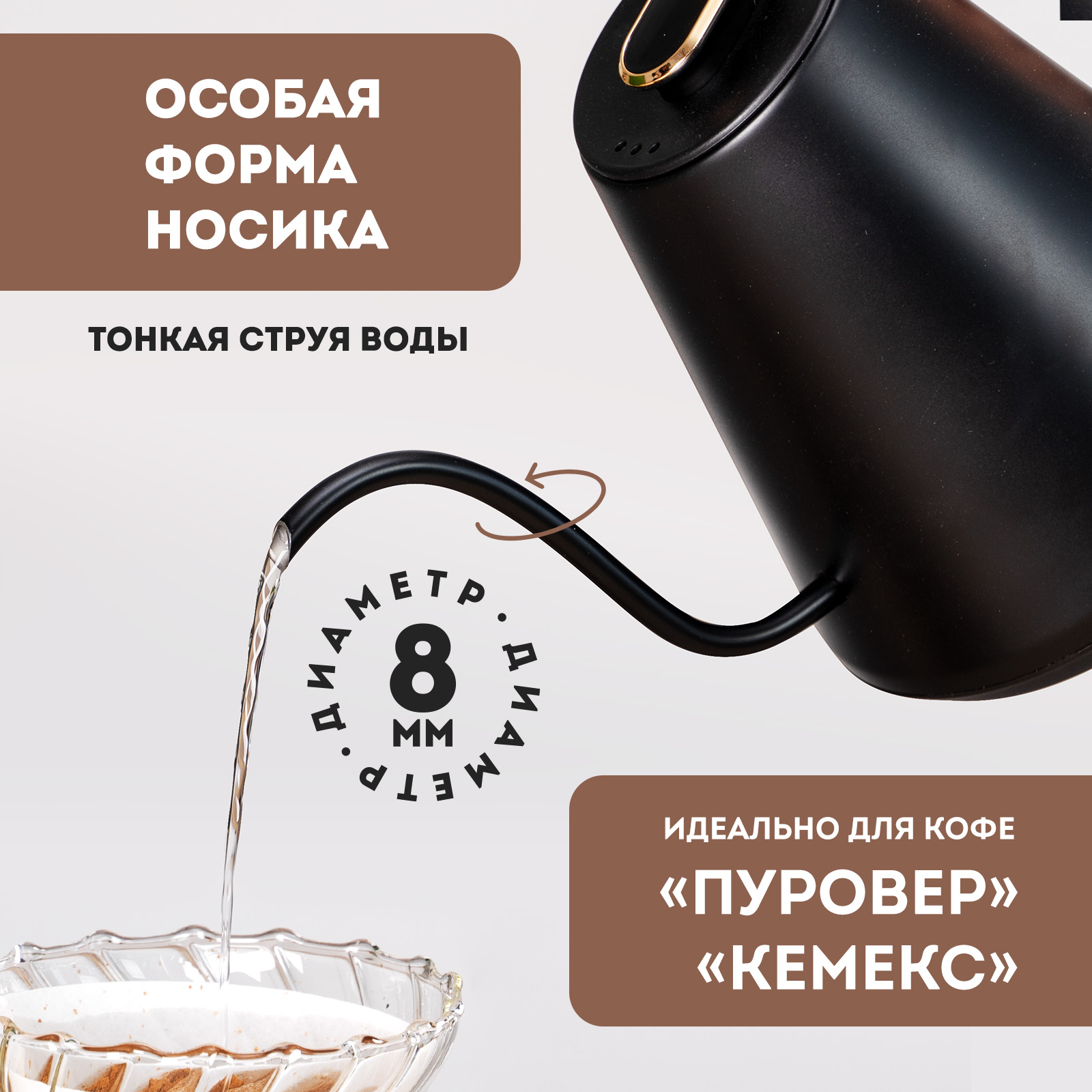 Чайник идеально подходит для заваривания кофе в воронках «пуровер» и «кемекс». Эргономичная ручка и компактный размер обеспечивают комфортное использование. Функция автоотключения при закипании и отсутствии воды гарантирует безопасность. Корпус из нержавеющей стали, съемная крышка и отсек для хранения шнура добавляют удобства.