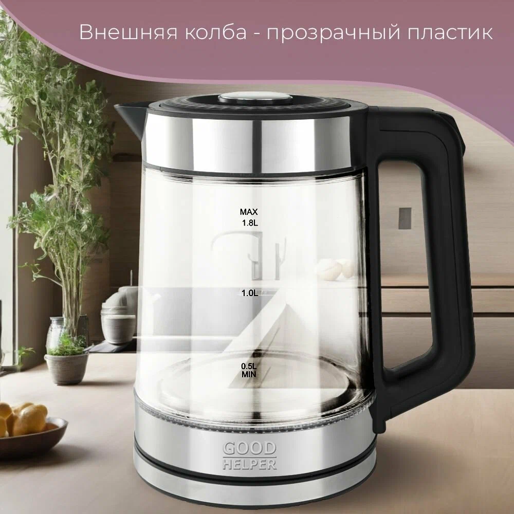 индикатор уровня воды, индикация включения, Вращение подставки на 360°, Двухслойный корпус