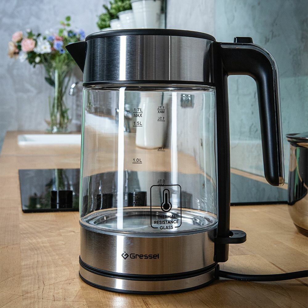 Электрический чайник Gressel GRK-1105, изготовленный из термостойкого стекла, нержавеющей стали и качественного пластика, станет настоящим украшением вашего дома или офиса. Современный дизайн и компактные размеры делают его идеальным выбором для любого интерьера.