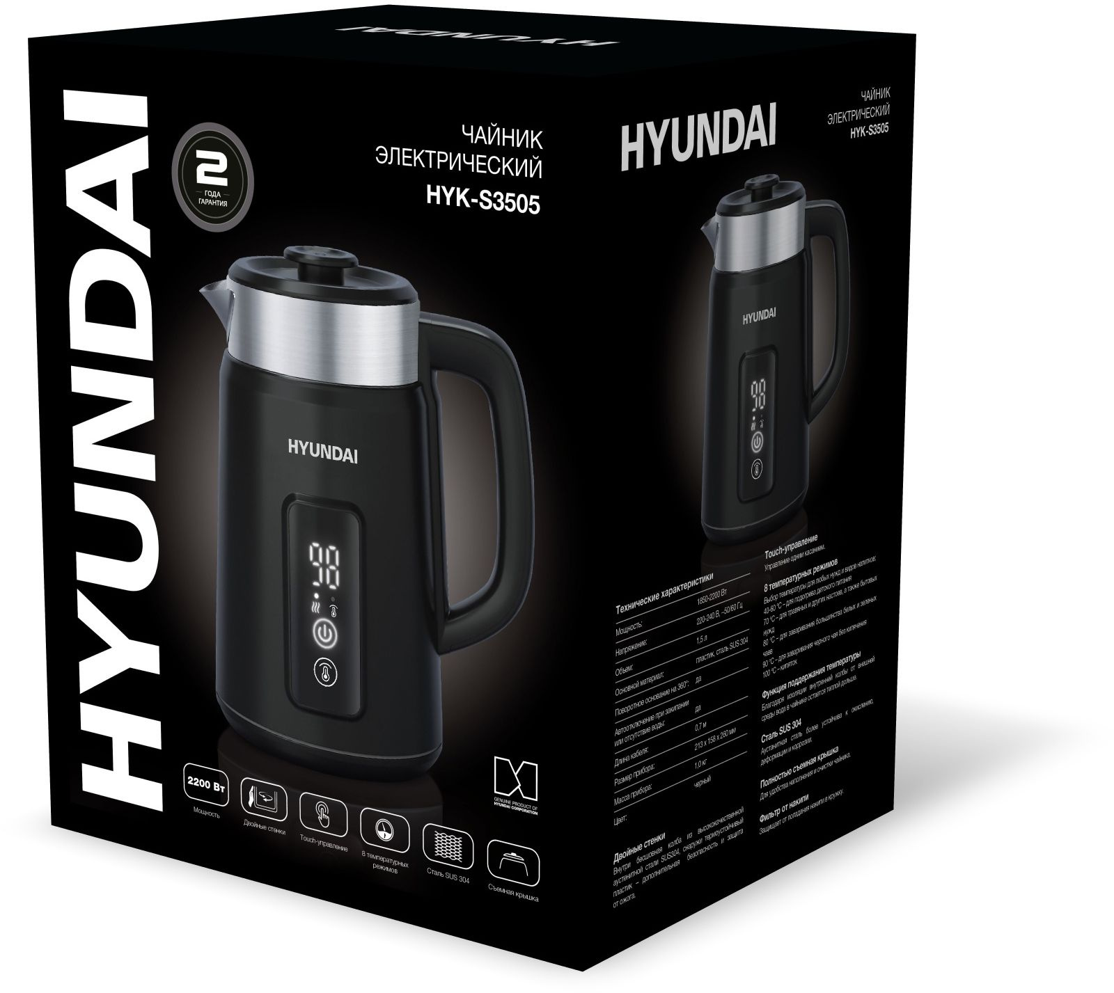 Двойной теплоизолированный корпус. Внешний корпус из термостойкого пластика, защищает от случайного ожога при прикосновении. Внутренний корпус из нержавеющей стали, не впитывает и не выделяет примесей. Эффект термоса - температура воды в чайнике дольше остается теплой.