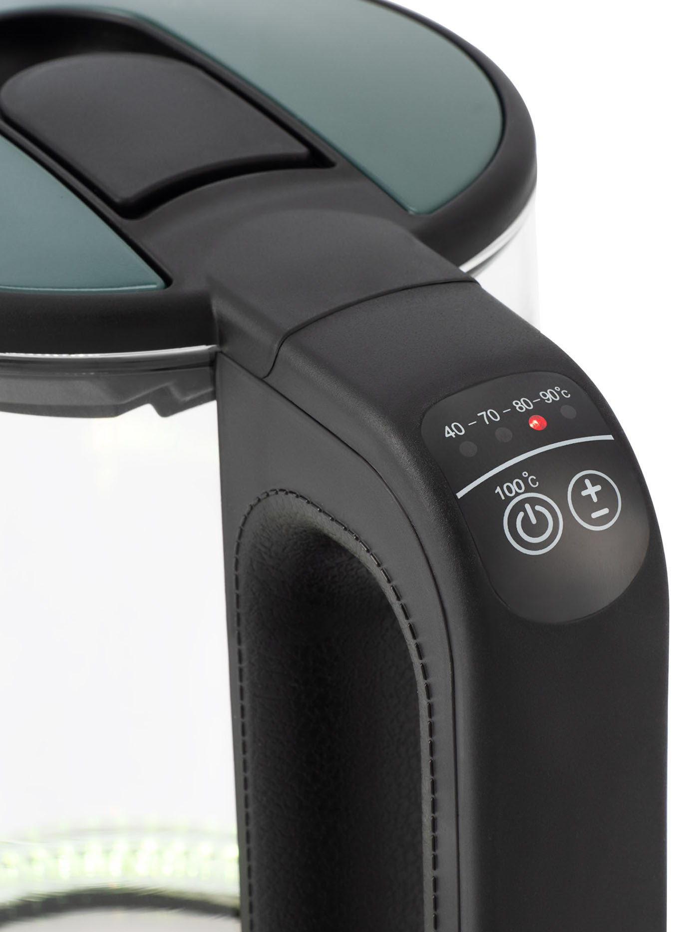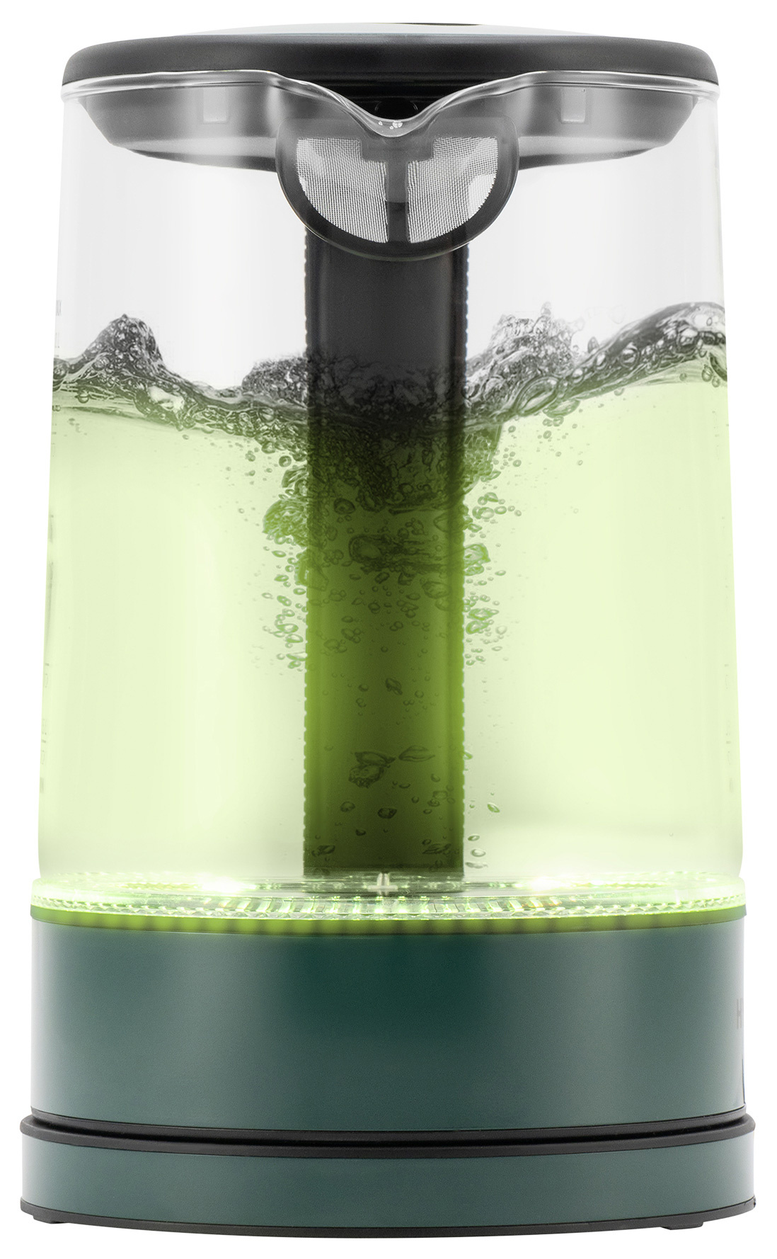 Стекло, из которого изготовлен корпус электрочайника, служит не только эстетичной деталью, но также помогает поддерживать температуру. На боковые стенки девайса нанесена разметка в миллилитрах и чашках. Она необходима, чтобы без открытия крышки можно было оценить объём оставшейся воды. Всего прибор вмещает до 1,7 л жидкости, которая нагревается спрятанным в подставку элементом мощностью 2200 Вт.