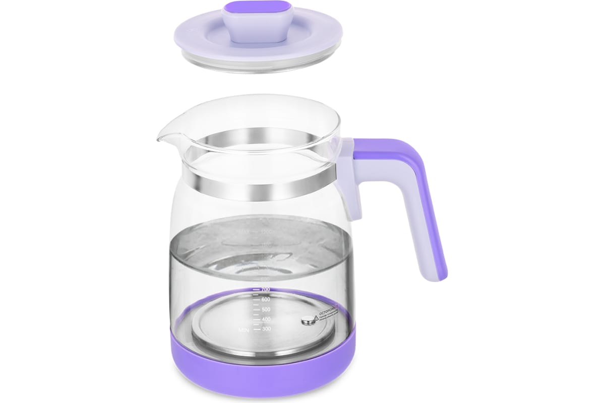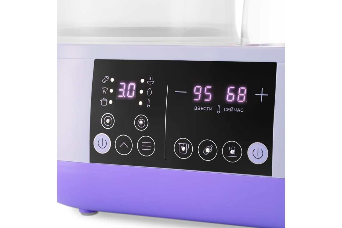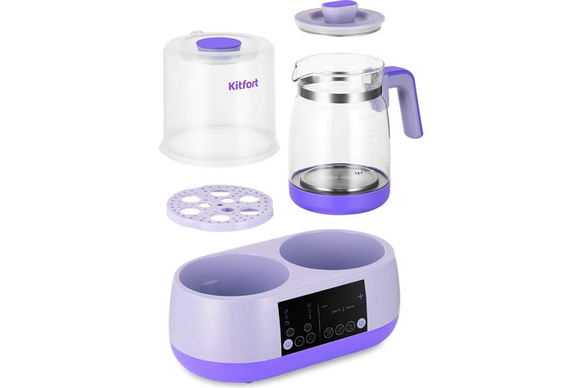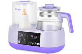 Чайник-стерилизатор КТ-2327 подогреет детское питание или молоко, простерилизует бутылочки, разогреет пюре, сварит кашу и яйца, а также вскипятит воду. Чайник и стерилизатор находятся на одной базе, но могут работать как вместе, так и по отдельности. КТ-2327 имеет сенсорную панель. На ней расположены дисплеи, на которых отображается температура, время приготовления и время поддержания температуры.