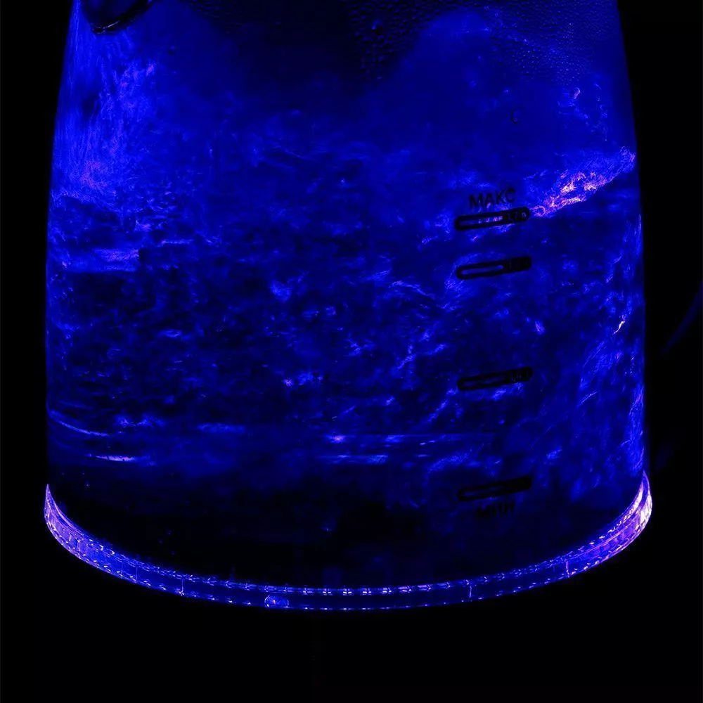 При включении чайника синяя подсветка по периметру дна сигнализирует о его рабочем состоянии, а также красиво подсвечивает корпус прибора и воду. Мерная шкала для удобства располагается на внешней стороне чайника.