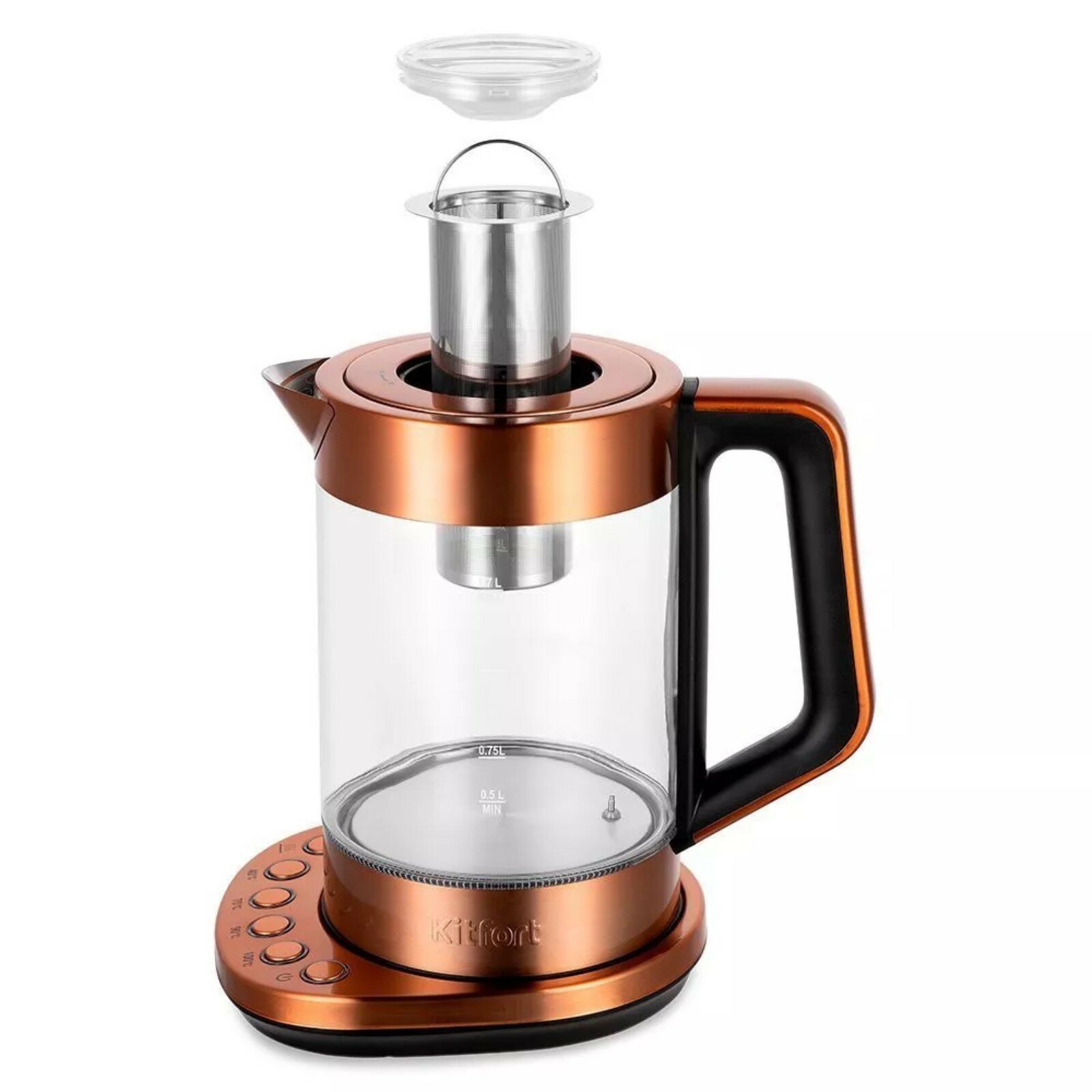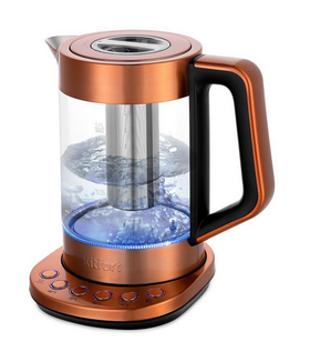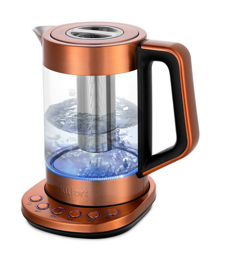 Электрический чайник с электронным терморегулятором Kitfort КТ-6655 может не только вскипятить воду, но и нагреть её до заданной температуры. Ёмкость чайника 1,7 л.