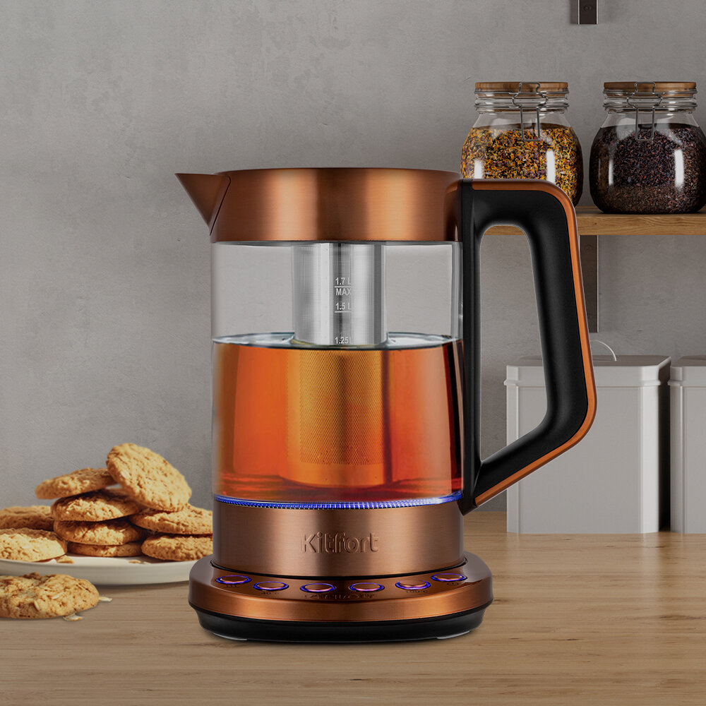 Для удобства в комплекте идёт съёмный чаезаварочный механизм, поэтому вы сможете заварить чай прямо в чайнике. Вам нужно только засыпать чайные листья в корзину, залить воду и выбрать необходимую температуру.