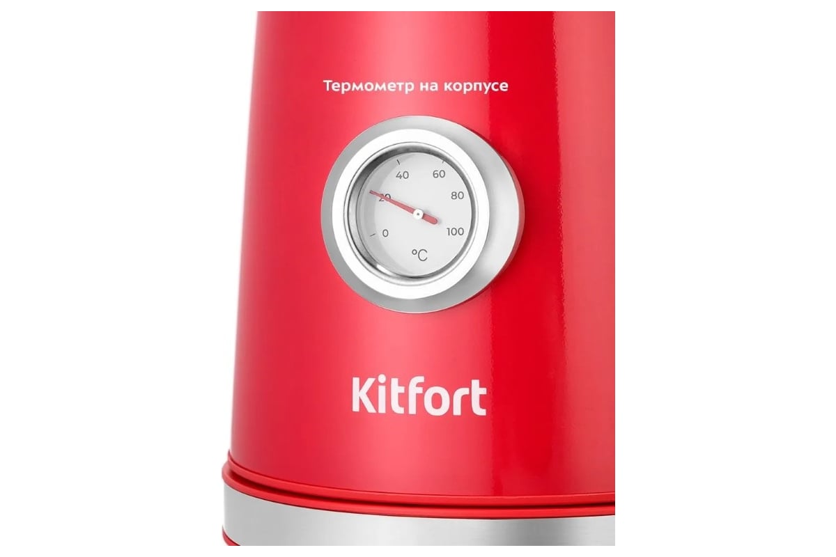 На корпусе чайника установлен термометр, который показывает температуру воды в чайнике. Это удобно, если вы готовите напитки, для которых требуется определенная температура воды, например, зеленый чай, белый чай, кофе и т. д. Принцип работы термометра термомеханический: биметаллическая пластина при изменении температуры деформируется и приводит в движение стрелку термометра. Для корректной работы термометра наполняйте чайник водой выше минимального уровня, чтобы щуп термометра полностью находился в воде.