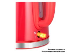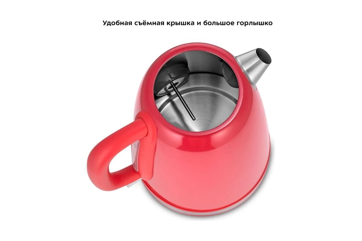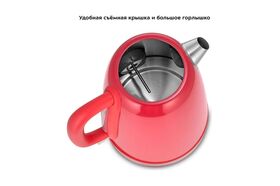 Корпус чайника из нержавеющей стали. Крышка выполнена из нержавеющей стали с сочетанием пластика, а подставка выполнена из пластика. Мерная шкала находится под ручкой. Ручка чайника пластиковая, не нагревается и удобно лежит в руке. Внутренняя поверхность чайника выполнена из нержавеющей стали, благодаря чему вода не соприкасается с пластиком.