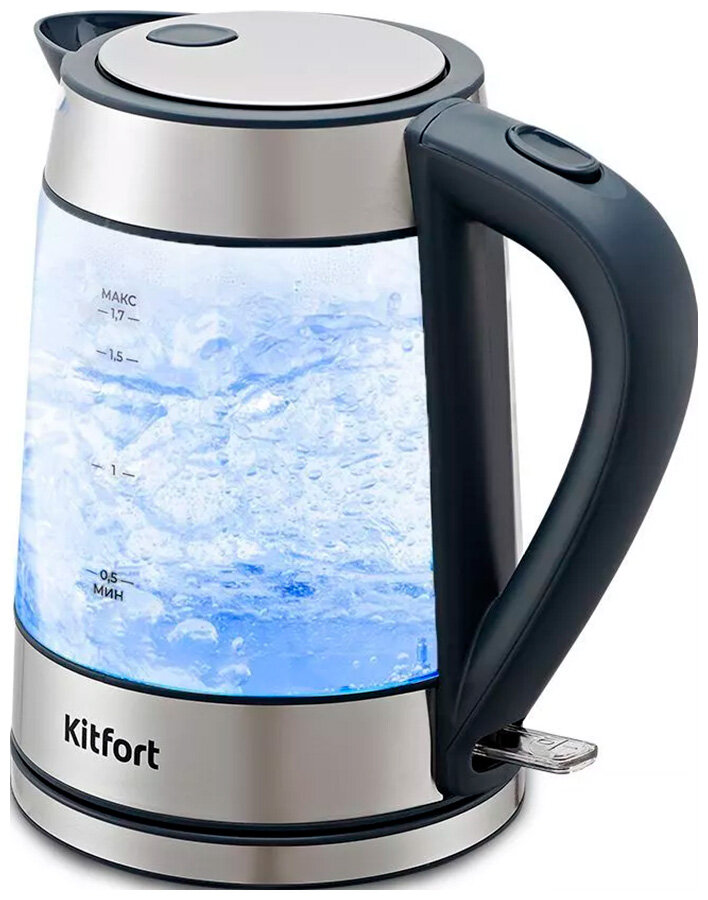 При включении чайника по периметру дна загорается синяя подсветка, которая является индикатором работы и одновременно художественно подсвечивает кипящую воду.