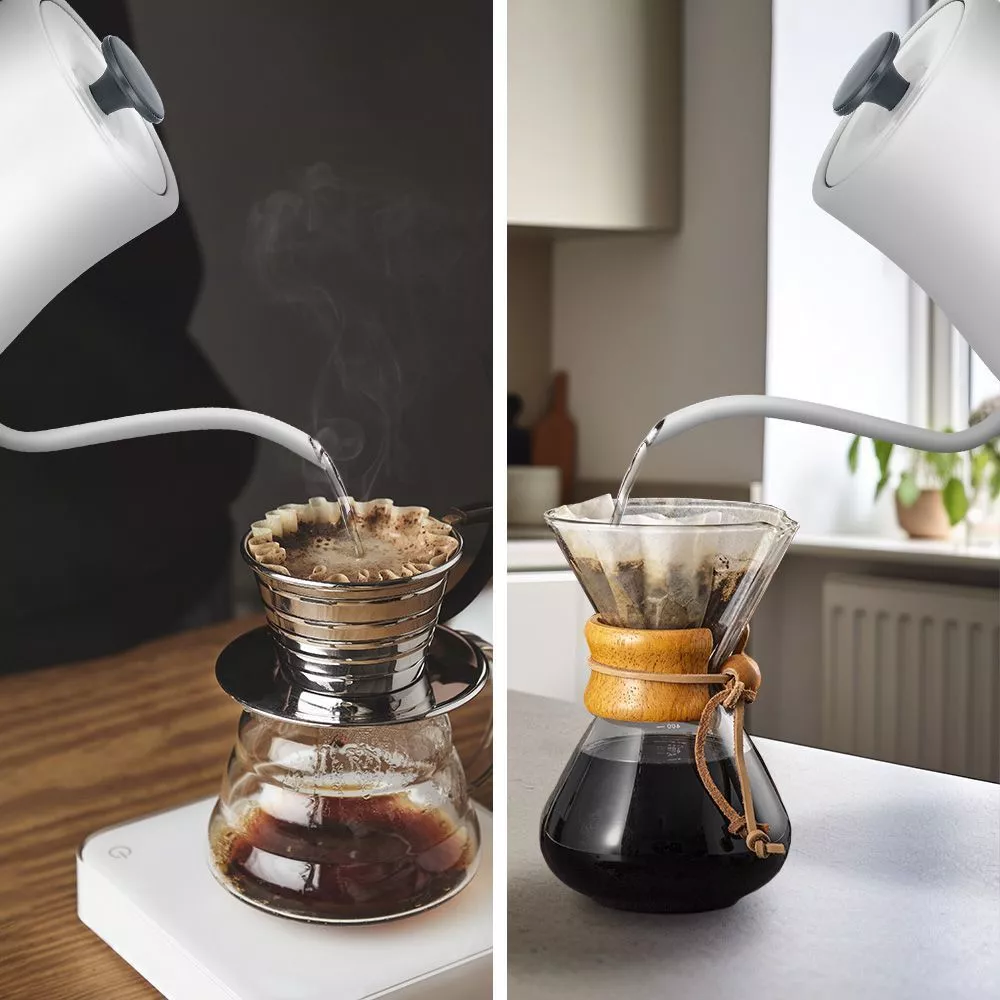 Длинный изогнутый носик чайника формирует тонкий и ровный поток воды, что является обязательным условием для приготовления кофе в кемексе или пуровере. Благодаря тонкому носику вы можете постепенно добавлять воду в кофе, добиваясь равномерной экстракции.