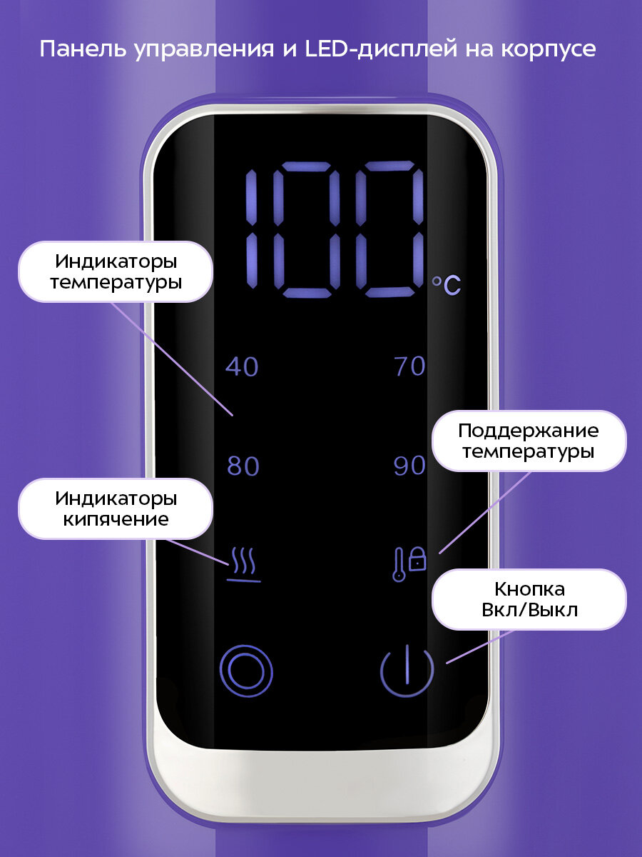 Чайник также оснащён функцией поддержания температуры воды в течение 2-х часов. Температура контролируется встроенным в дно термодатчиком. На LED-дисплее отображается текущая температура воды в чайнике, а при установке температуры – температура нагрева.