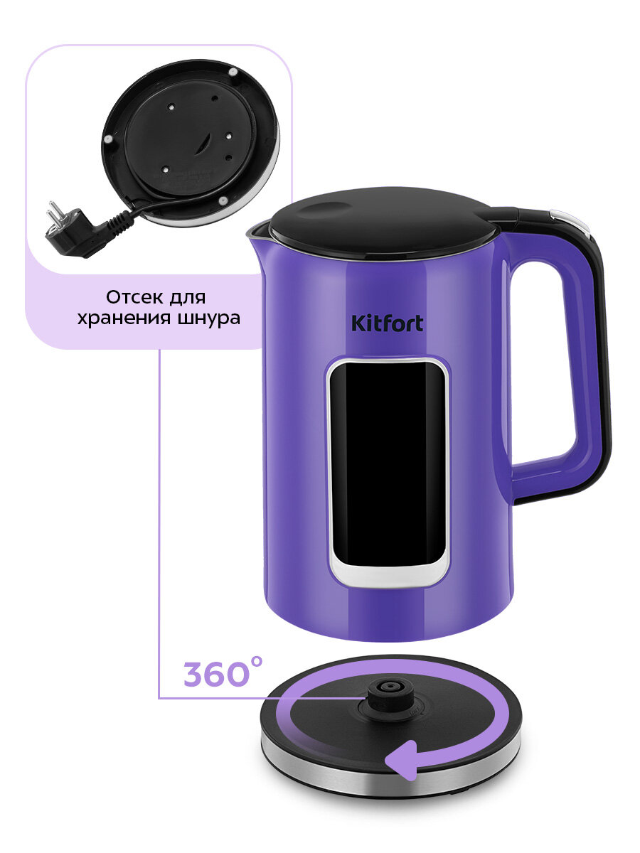 Подставка с центральным контактом даёт возможность располагать на ней чайник в любом положении, обеспечивая вращение на 360°. Снизу имеется отсек для хранения шнура, в который можно смотать излишки шнура электропитания.