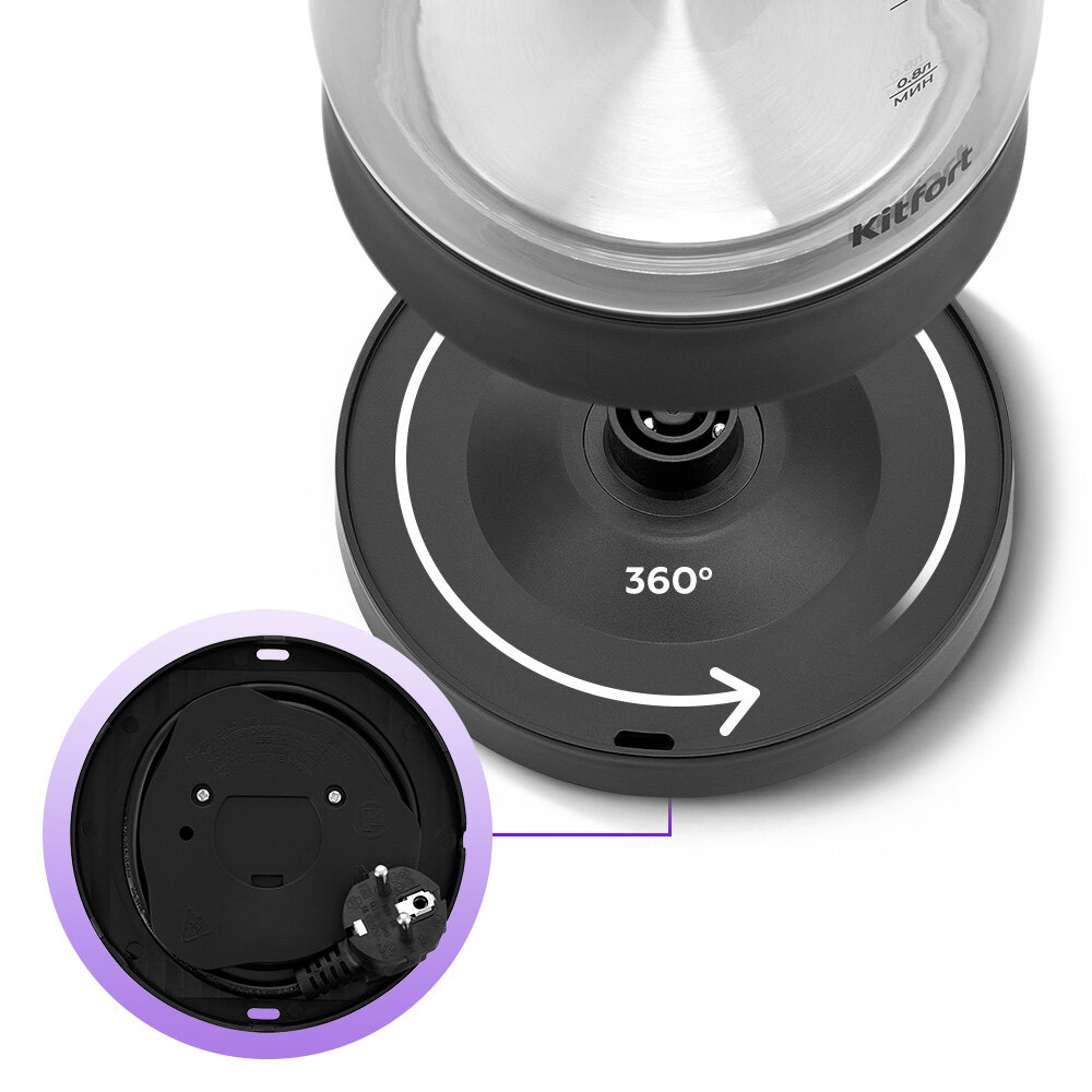 Подставка с центральным контактом даёт возможность располагать на ней чайник в любом положении, обеспечивая вращение на 360°. Снизу имеется отсек для хранения шнура, в который можно смотать излишки шнура электропитания, чтобы он не мешал на столе.