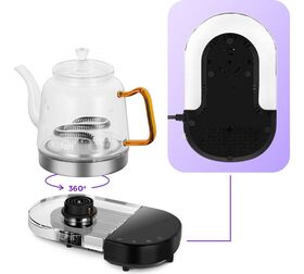Корпус и крышка чайника сделаны из стекла. Стекло является экологически чистым материалом, и не будет выделять токсичных веществ в отличие, например, от пластика. У чайника есть стеклянная подставка с панелью управления и сенсорными кнопками. Стеклянная подставка с центральным контактом дает возможность располагать на ней чайник в любом положении, обеспечивая вращение на 360°. Во время работы чайника внутри подставки загорается световой индикатор.