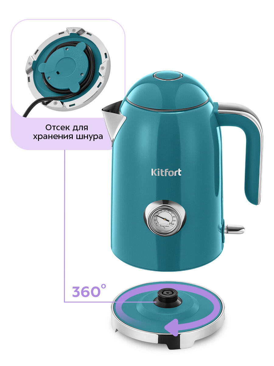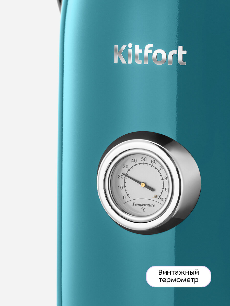Чайник Kitfort КТ-6740 имеет встроенный термометр, выполненный в винтажном стиле. Это очень удобно для заваривания различных напитков, для которых требуется определённая температура воды. Например, зелёный чай, белый чай, кофе и тд.