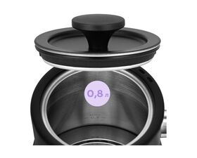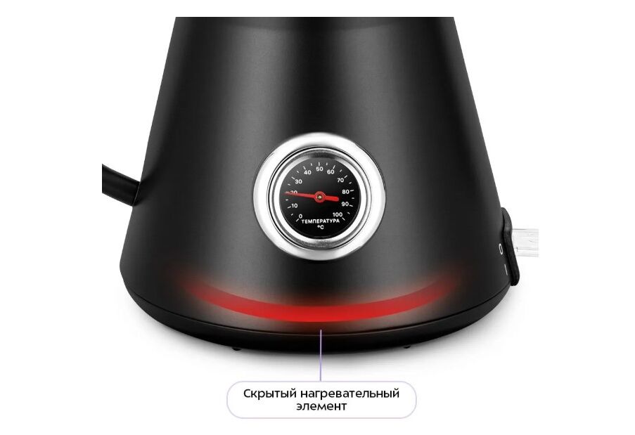 Биметаллический термометр, расположенный на корпусе чайника, помогает контролировать температуру воды при кипячении, что удобно при приготовлении кофе. Для корректной работы термометра чайник должен быть наполнен водой выше минимального уровня.