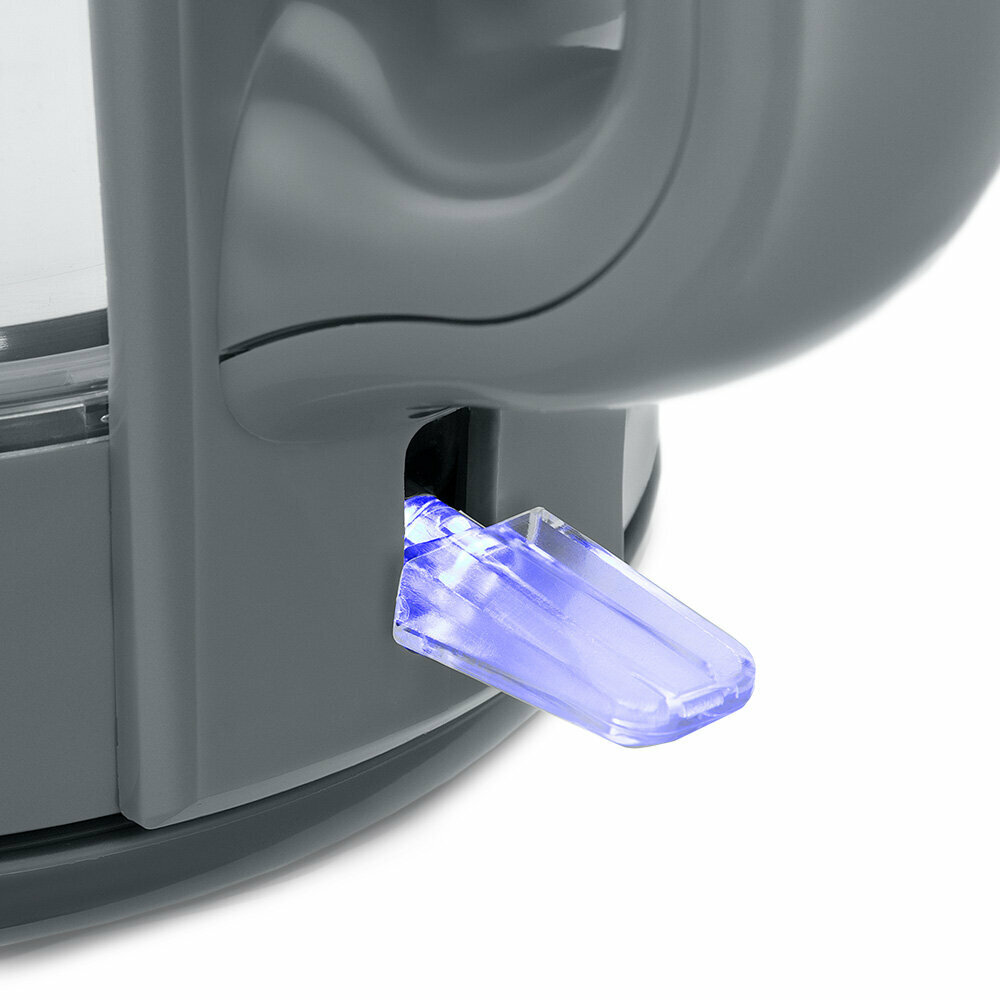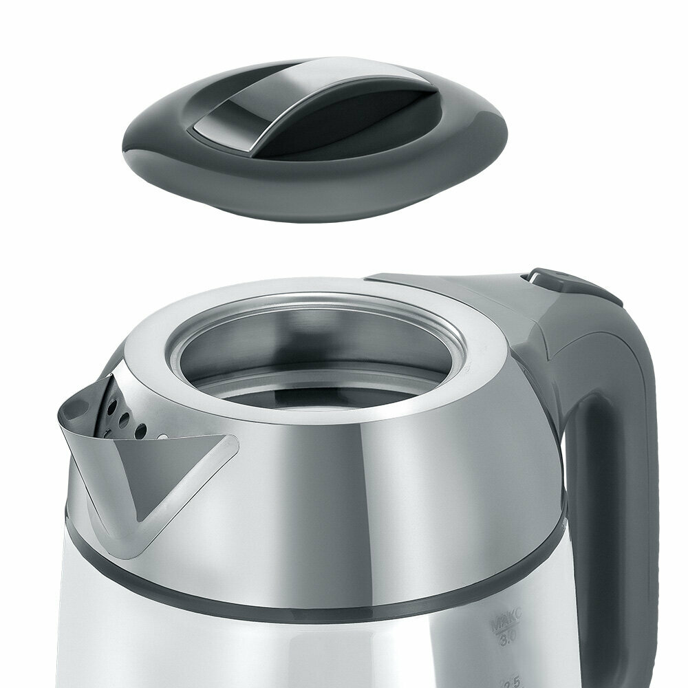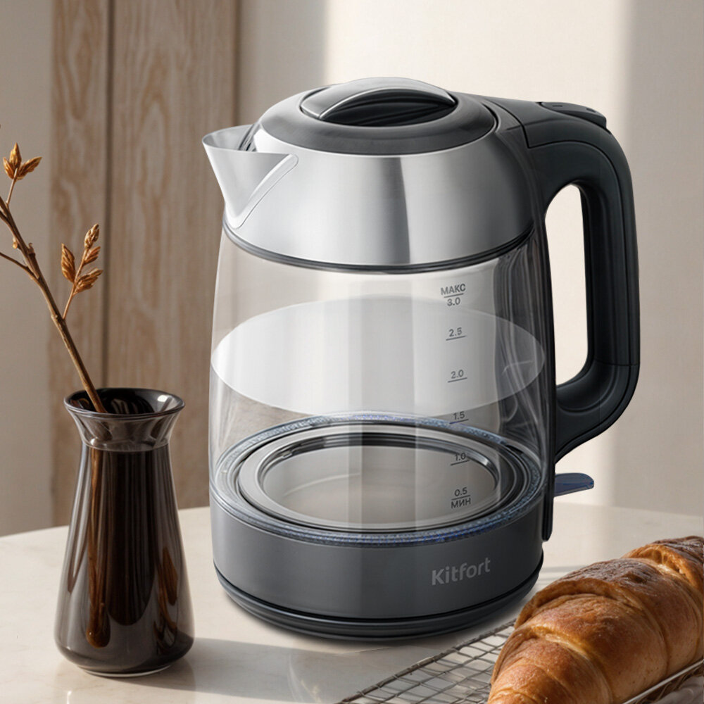 Колба чайника выполнена из стекла, а крышка и корпус из нержавеющей стали и пластика, что позволяет ему долго сохранять температуру внутри. Крышка чайника полностью съёмная.