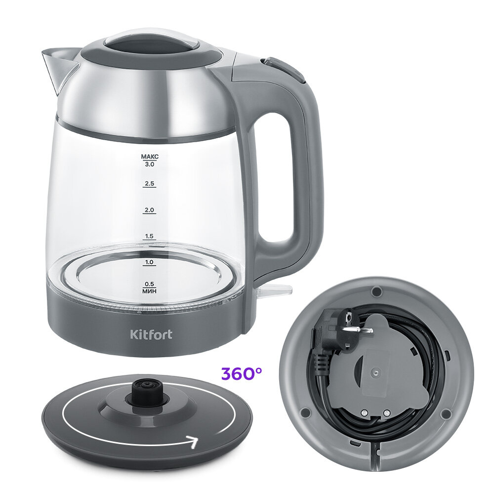 Подставка с центральным контактом даёт возможность располагать на ней чайник в любом положении, обеспечивая вращение на 360°. Снизу имеется отсек для хранения шнура, в который можно смотать излишки шнура электропитания, чтобы он не мешал на столе.