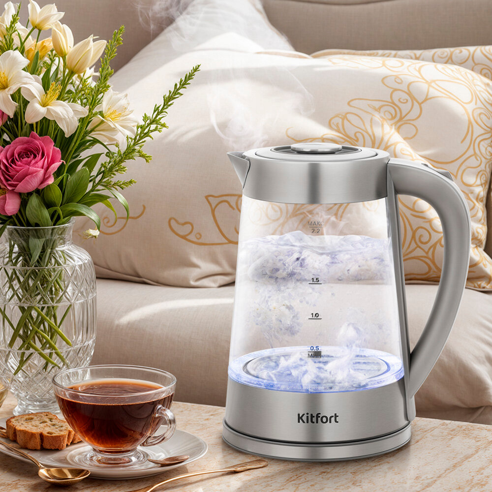 Электрический чайник КТ-6763 предназначен для кипячения воды дома, в офисе, на даче. Полный чайник закипает примерно за 6 минут. Чайник автоматически отключается при закипании, имеет защиту от перегрева и от включения без воды.