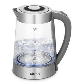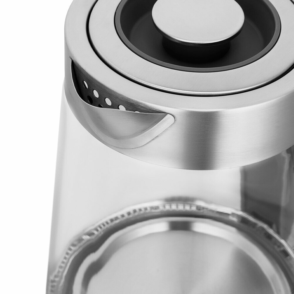 Колба чайника выполнена из стекла. Корпус чайника выполнен из нержавеющей стали и пластика. Мерная шкала находится на лицевой стороне корпуса. Ручка чайника пластиковая, она не нагревается и удобно лежит в руке.