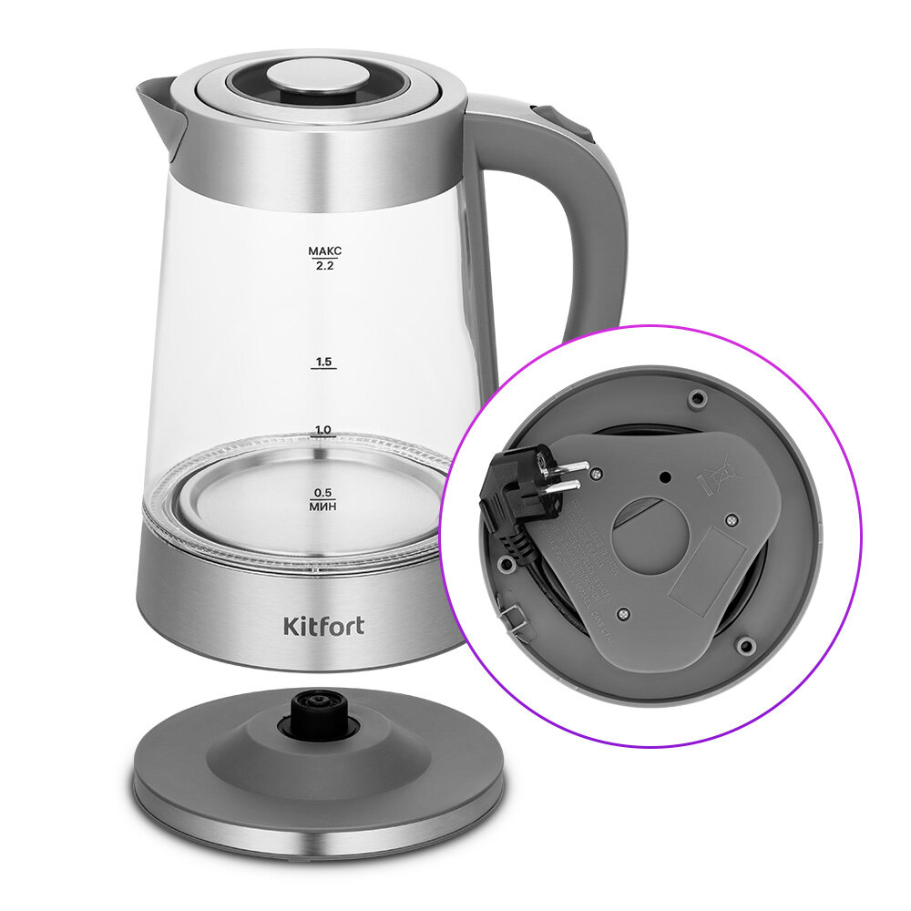 Подставка с центральным контактом даёт возможность располагать на ней чайник в любом положении, обеспечивая вращение на 360°. Снизу имеется отсек для хранения шнура, в который можно смотать излишки шнура электропитания, чтобы он не мешал на столе.