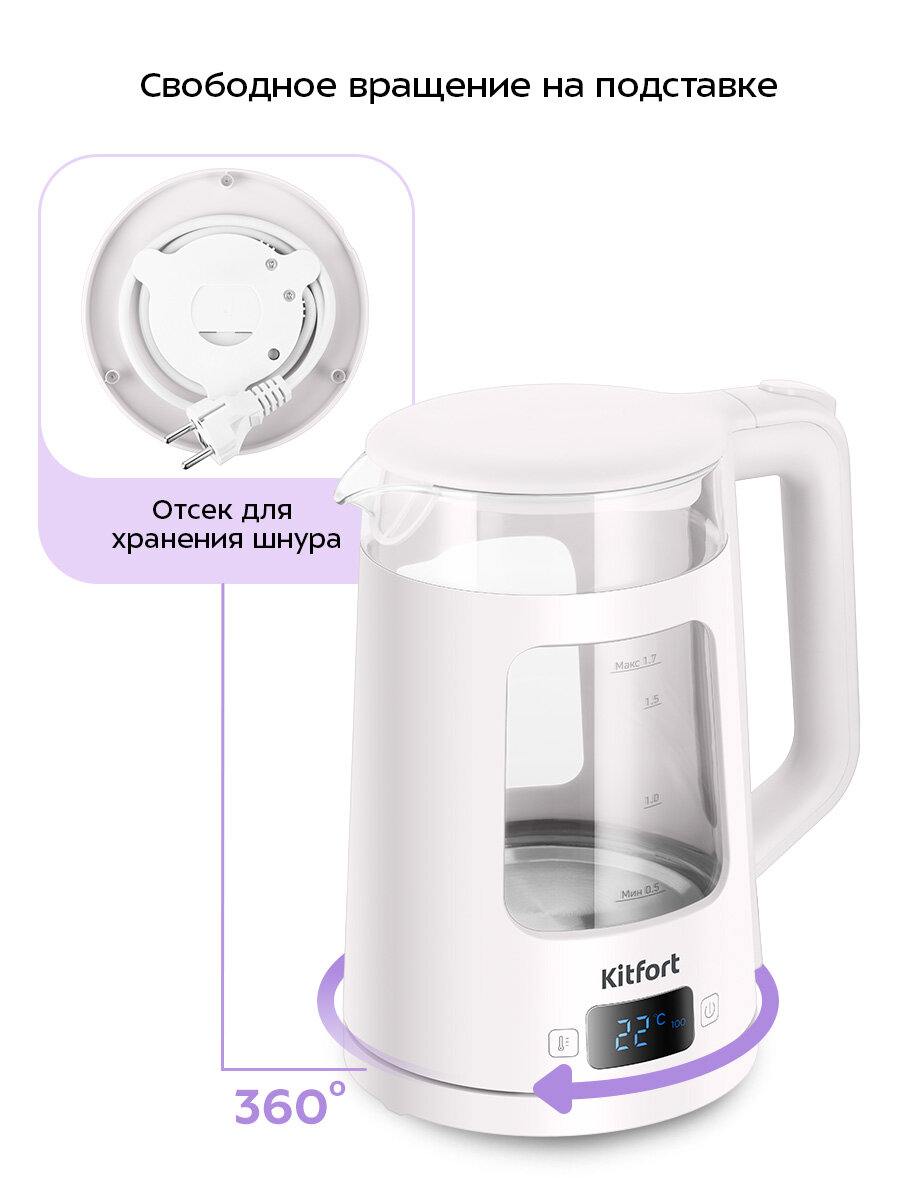 Подставка с центральным контактом даёт возможность располагать на ней чайник в любом положении, обеспечивая вращение на 360°. Снизу подставки расположен отсек для хранения шнура, чтобы шнур не мешал на столе.