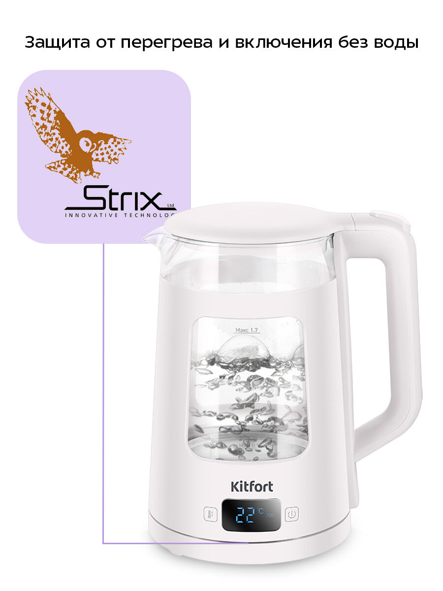 Чайник автоматически выключается при достижении заданной температуры. Имеет двойную защиту: от перегрева и включения без воды. Оснащён надёжным контроллером Strix, который гарантирует безопасность и увеличивает срок службы прибора.