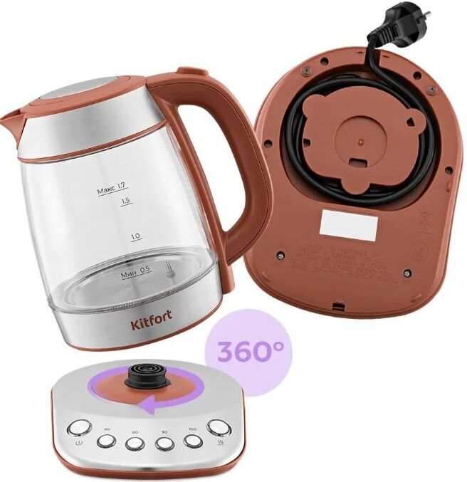 База с центральным контактом даёт возможность располагать на ней чайник в любом положении, обеспечивая вращение на 360°. Чайник автоматически отключается при закипании, имеет защиту от перегрева и от включения без воды.