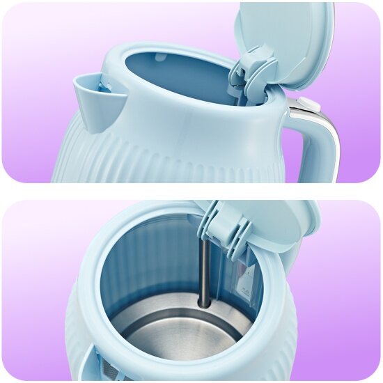 Чайник КТ-6790 управляется 1 кнопкой. Чайник автоматически отключается при закипании, имеет защиту от перегрева и от включения без воды. В носике чайника расположен фильтр от накипи.
