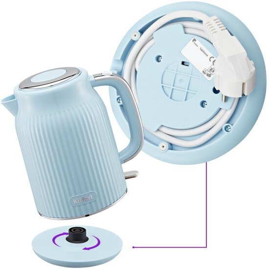 Подставка с центральным контактом дает возможность располагать на ней чайник в любом положении‚ обеспечивая вращение на 360°. Снизу имеется отсек для хранения шнура, в который можно смотать излишки шнура электропитания, чтобы он не мешал на столе.