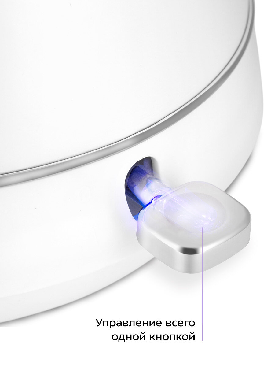 Переключатель находится на корпусе снизу. При включении чайника загорается подсветка переключателя, которая является индикатором работы. Полный чайник закипает примерно за 5 минут.