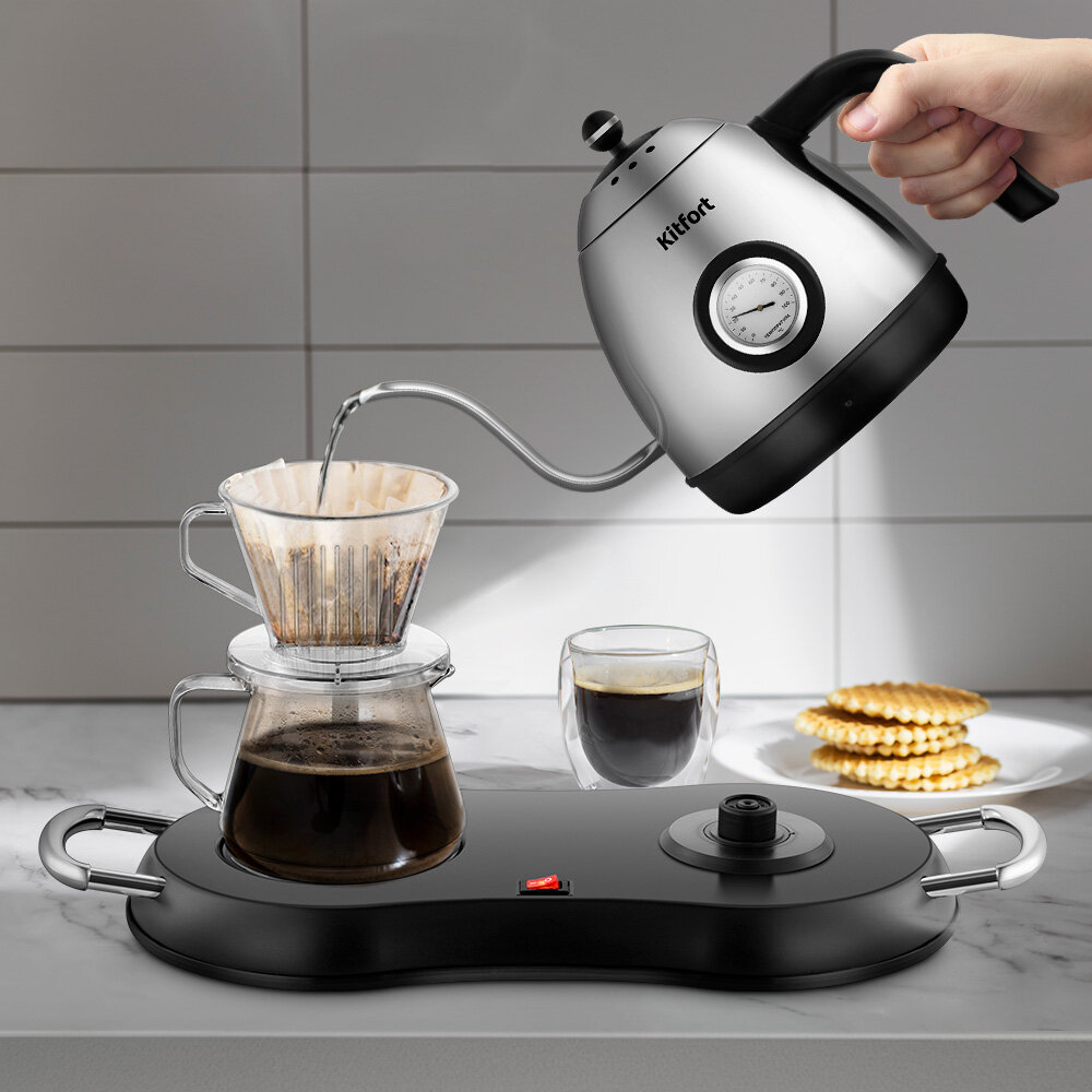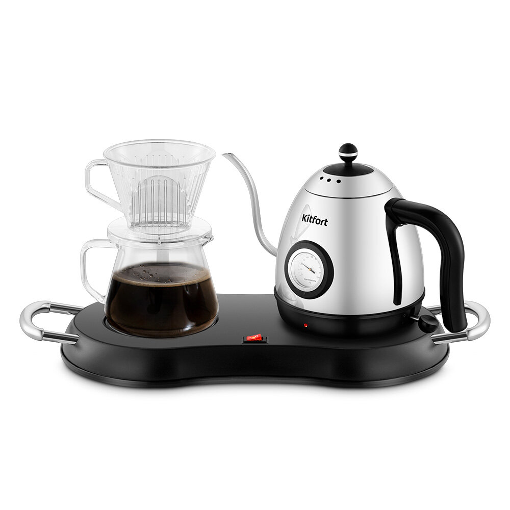 Кофейный набор КТ-7543 объединяет на одной платформе специальный чайник для заваривания кофе и кофейник с воронкой, которая понадобиться для Hario V60. Платформа начинает работу с одной кнопки, включая подогрев кофейника и чайника.