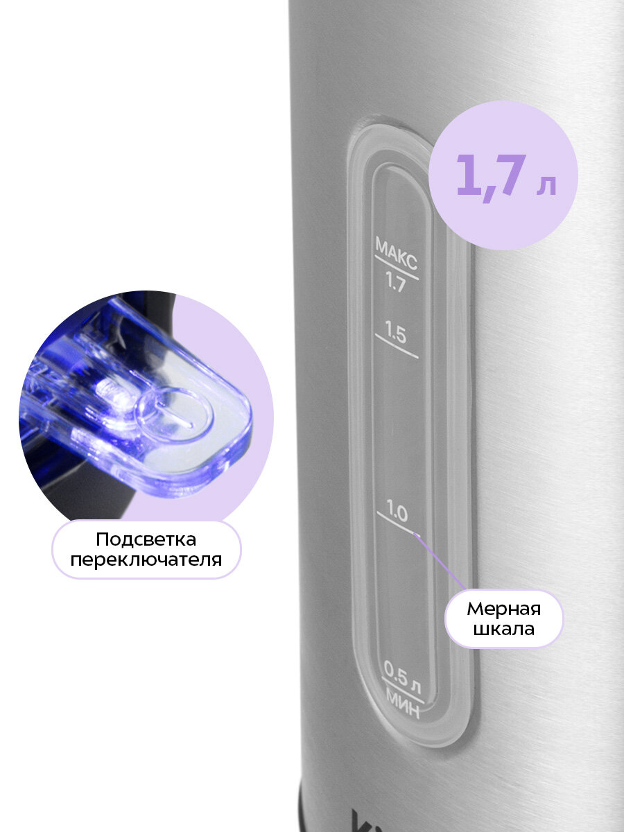 Переключатель расположен под ручкой. При включении чайника загорается подсветка переключателя, которая является индикатором работы. Мерная шкала находится сбоку на корпусе чайника и позволяет контролировать объём наливаемой воды.