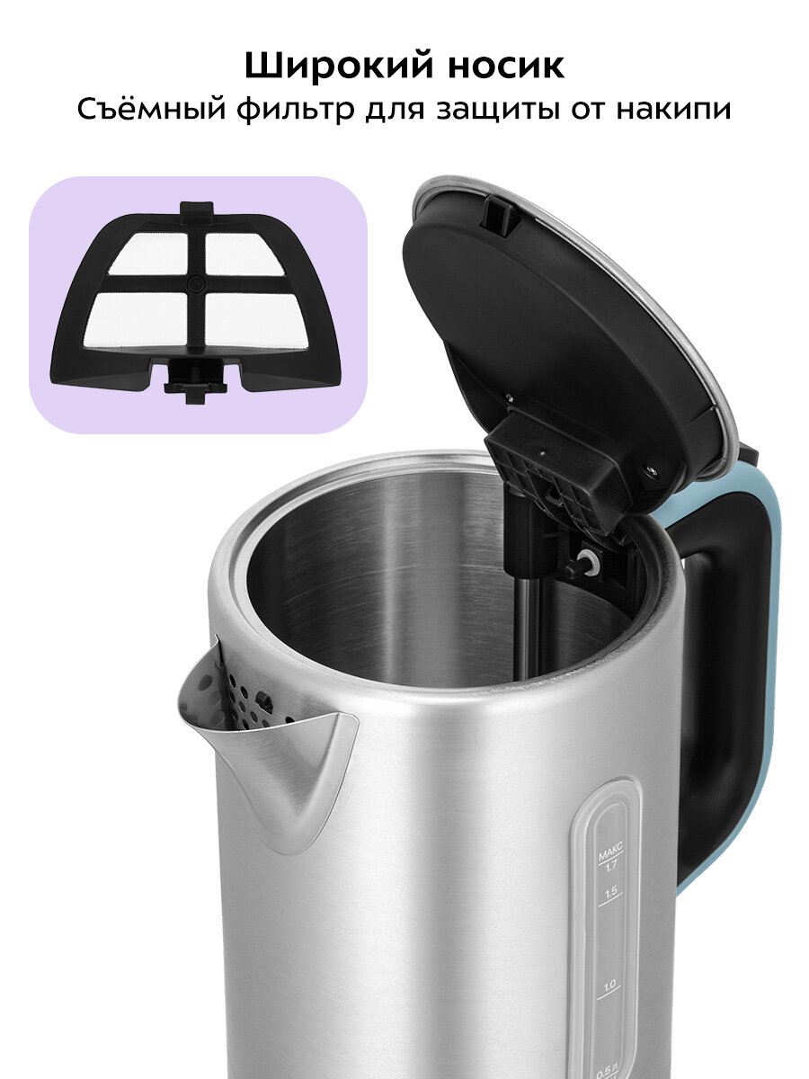 Специальная форма носика позволяет точно наливать воду в чашку без расплёскивания и брызг и быстро наполнять её. В носике чайника расположен съёмный фильтр от накипи, который задерживает частички накипи и предотвращает их попадание в чашку.
