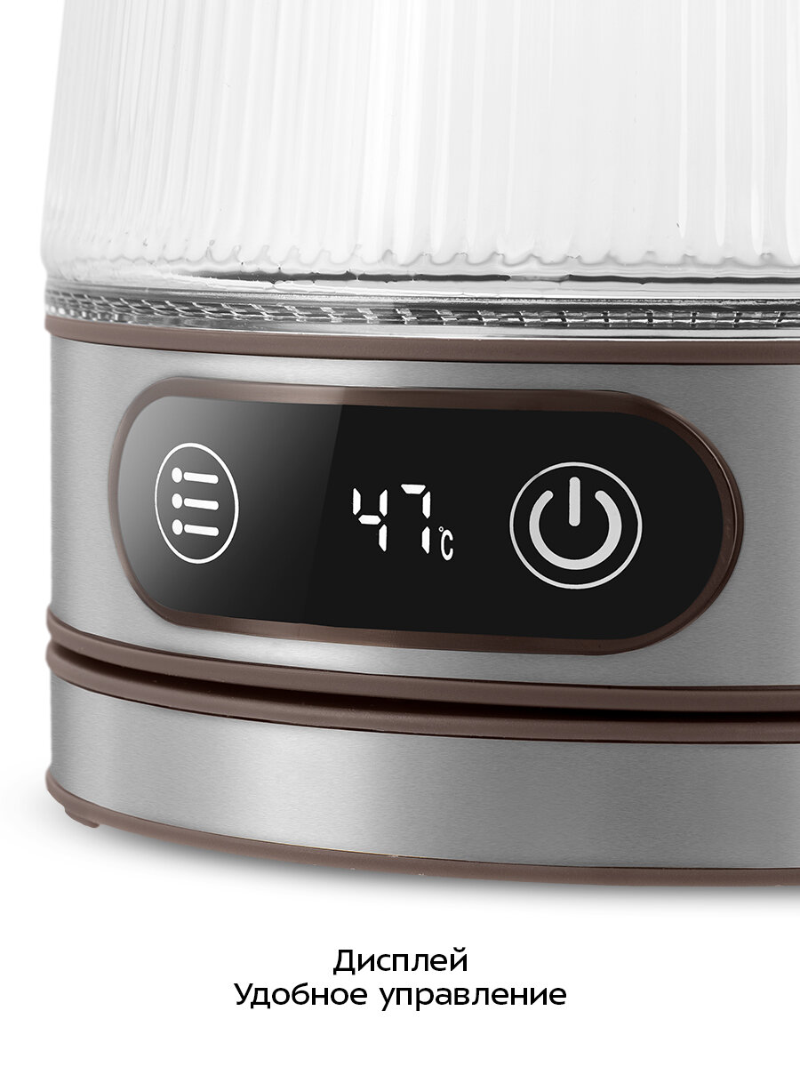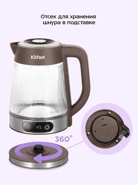 Электрический чайник Kitfort КТ-8710 может не только вскипятить воду, но и нагреть её от 40 до 90 °C с шагом 10 °C, что очень удобно при заваривании различных сортов чая. Температура воды контролируется встроенным термодатчиком.