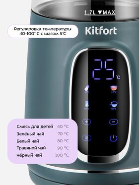 Электрический чайник КТ-8755 подходит для кипячения и нагрева воды где угодно. Он позволяет установить температуру от 40 до 100 °С с шагом в 5 °С. Также можно быстро выбрать 40, 70, 80 или 90 °С одним нажатием кнопки.