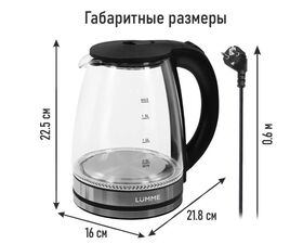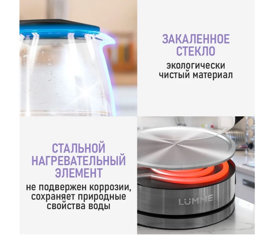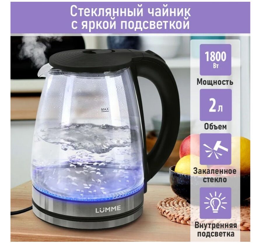 Легкий чайник с внутренней подсветкой в элегантном прозрачном корпусе из закаленного термостойкого стекла объемом 2 литра. Термостойкое стекло сохраняет природный вкус и натуральные свойства воды.